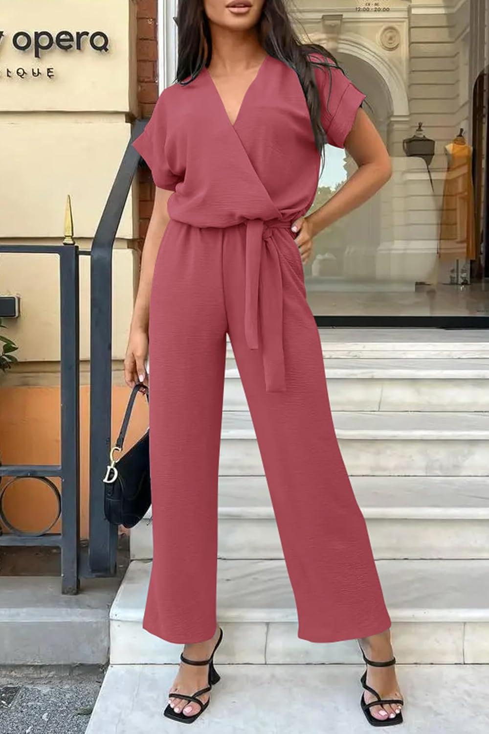PRETTYGARDEN Women’s Summer One Piece Jumpsuits Belted Short Sleeve Wrap V Neck Fashion Dressy Casual Wide Leg Pants Romper(Dark Pink)