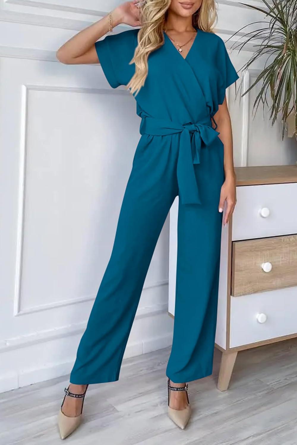 PRETTYGARDEN Women's Summer One Piece Jumpsuits Belted Short Sleeve Wrap V Neck Fashion Dressy Casual Wide Leg Pants Romper(Lake Blue)