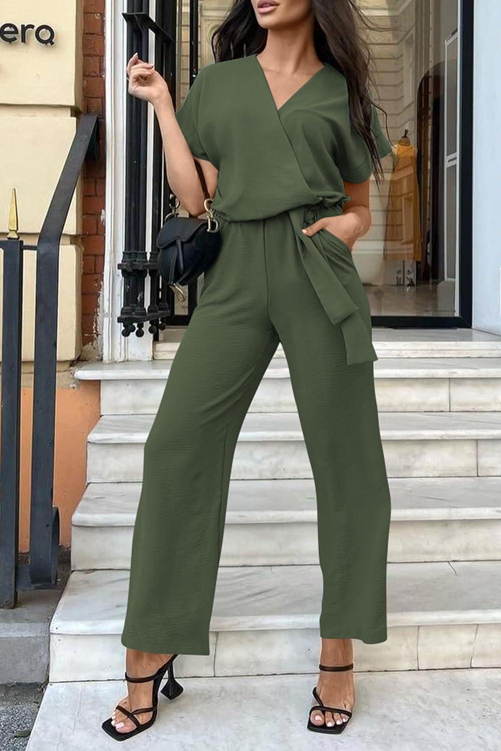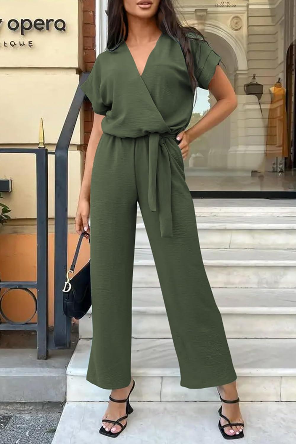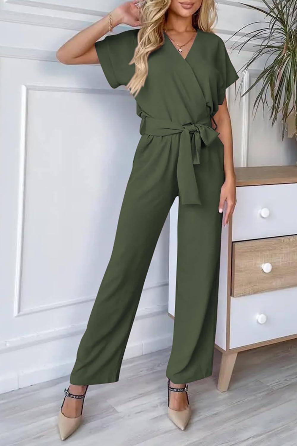 PRETTYGARDEN Women's Summer One Piece Jumpsuits Belted Short Sleeve Wrap V Neck Fashion Dressy Casual Wide Leg Pants Romper(Light Army Green)
