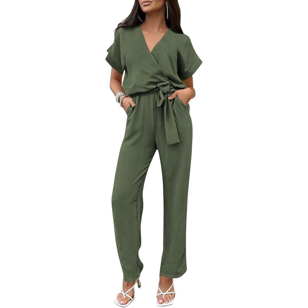 imagePRETTYGARDEN Womens Summer One Piece Jumpsuits Belted Short Sleeve Wrap V Neck Fashion Dressy Casual Wide Leg Pants RomperLight Army Green
