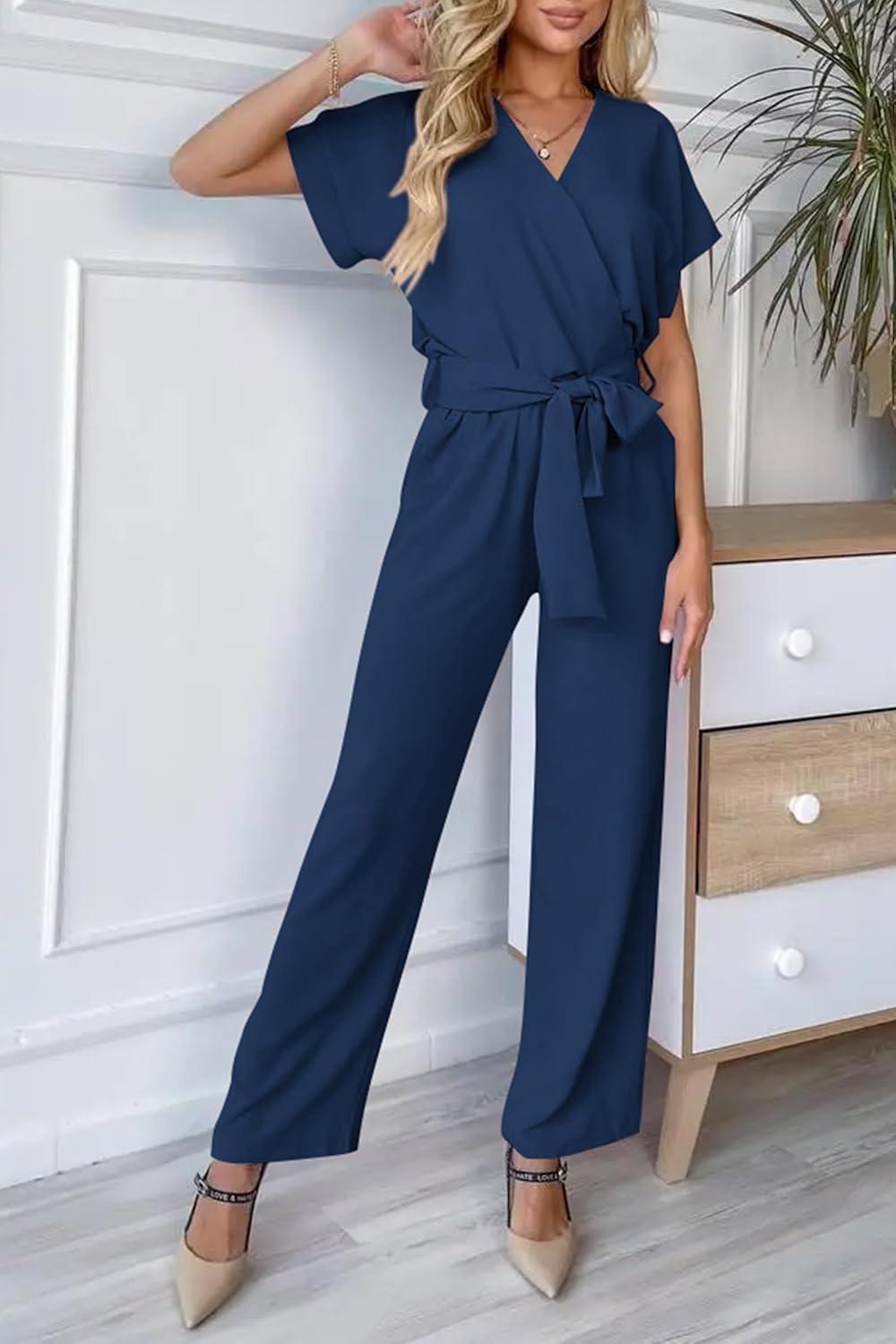 PRETTYGARDEN Women’s Summer One Piece Jumpsuits Belted Short Sleeve Wrap V Neck Fashion Dressy Casual Wide Leg Pants Romper(Navy)
