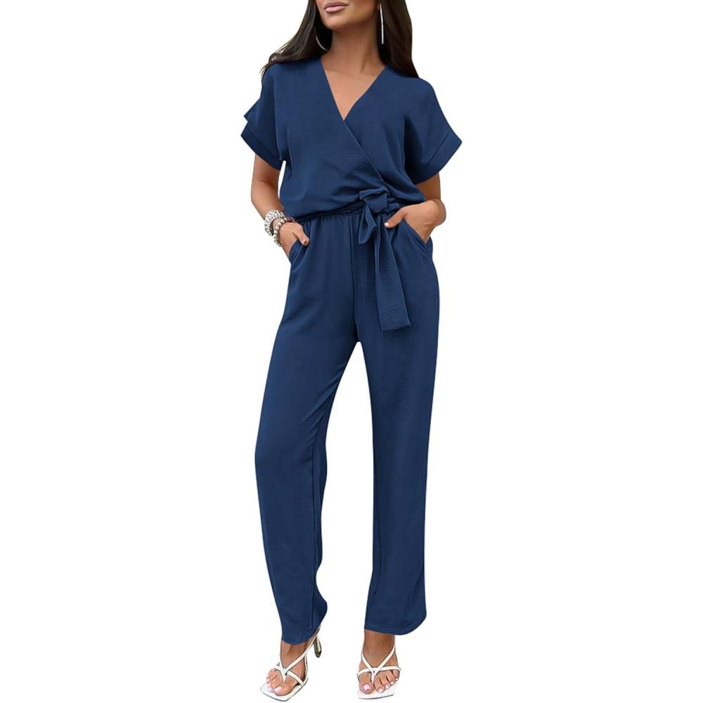 PRETTYGARDEN Women's Summer One Piece Jumpsuits Belted Short Sleeve Wrap V Neck Fashion Dressy Casual Wide Leg Pants Romper(Navy)