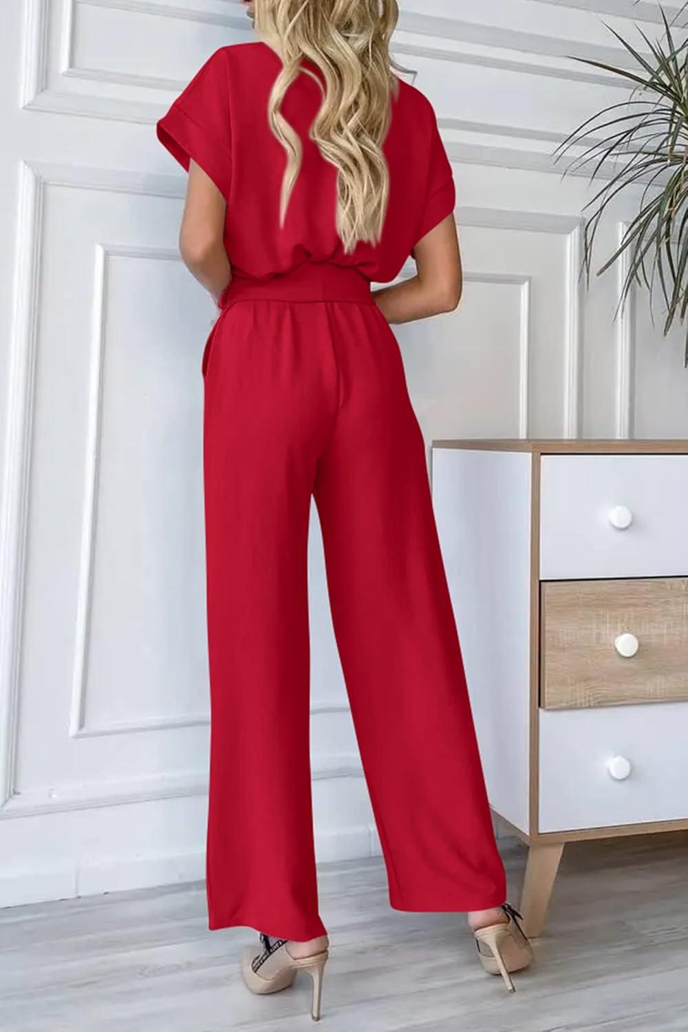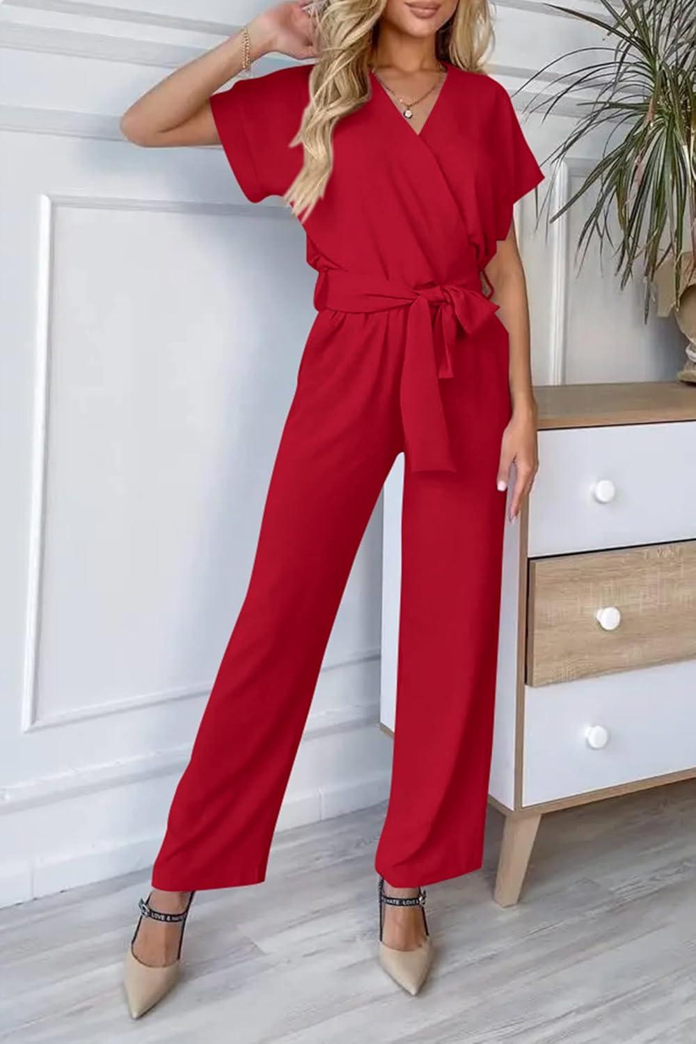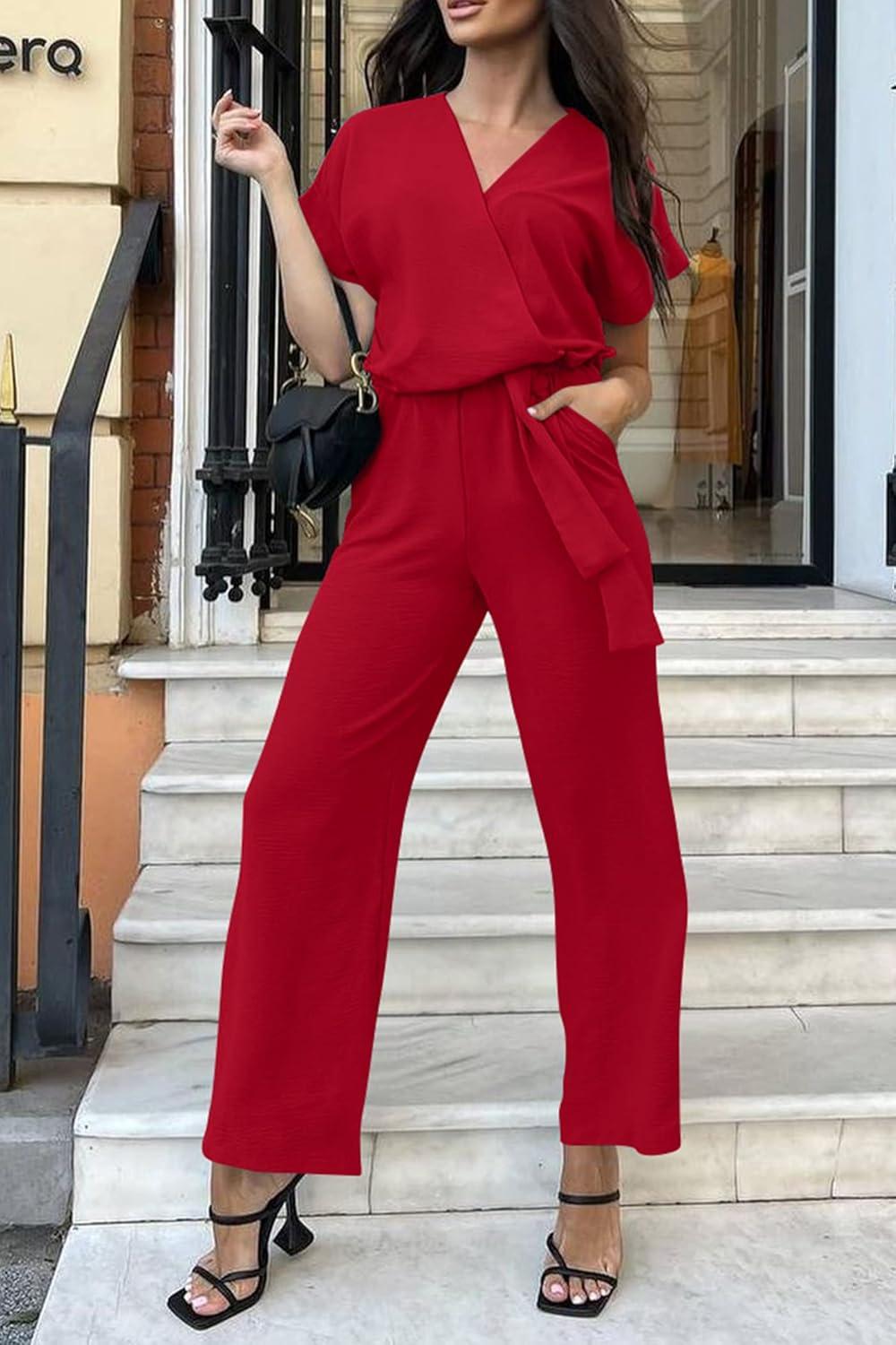 PRETTYGARDEN Women's Summer One Piece Jumpsuits Belted Short Sleeve Wrap V Neck Fashion Dressy Casual Wide Leg Pants Romper(Red)