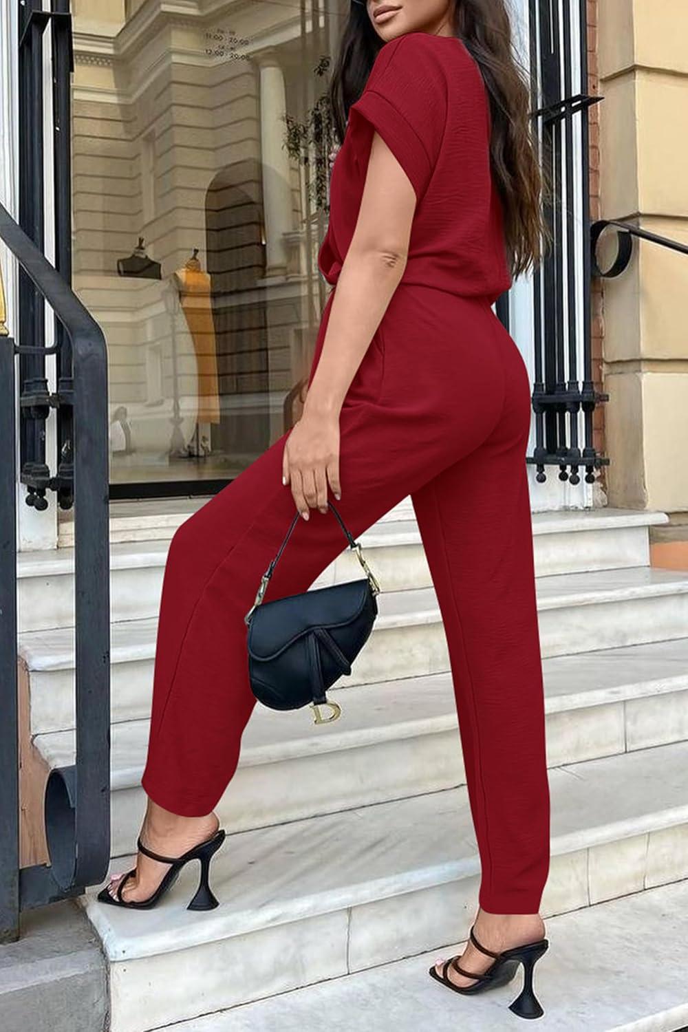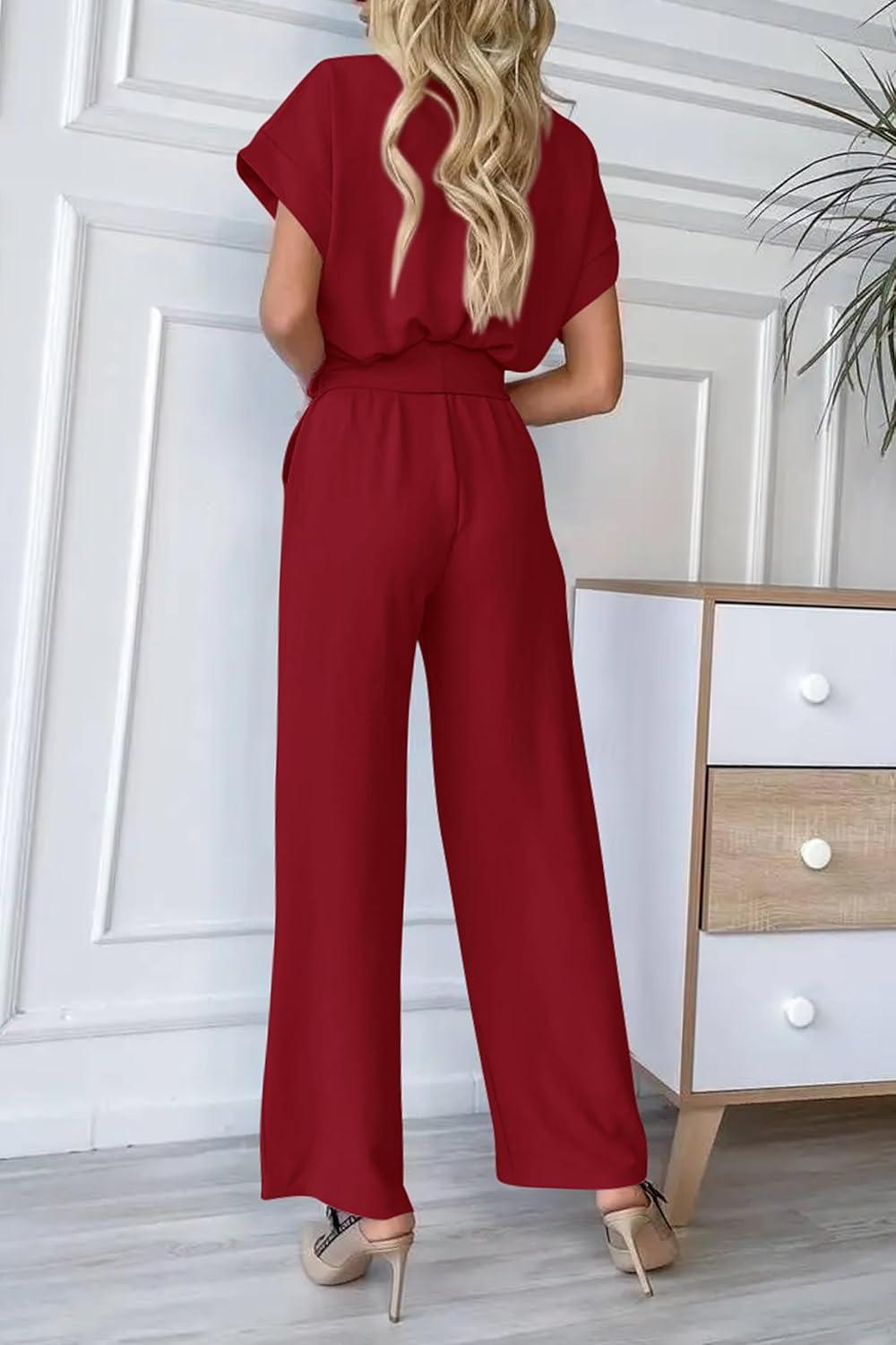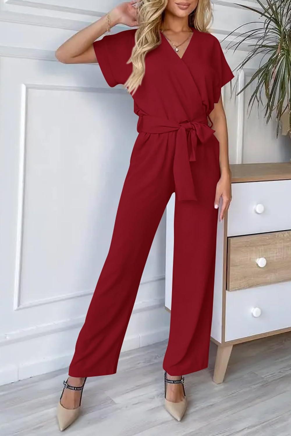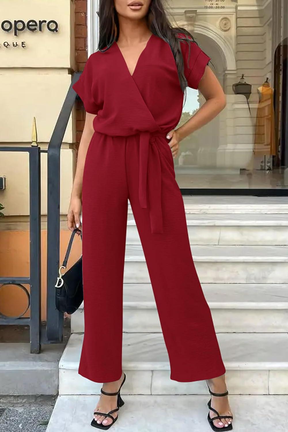 PRETTYGARDEN Women's Summer One Piece Jumpsuits Belted Short Sleeve Wrap V Neck Fashion Dressy Casual Wide Leg Pants Romper(Wine Red)