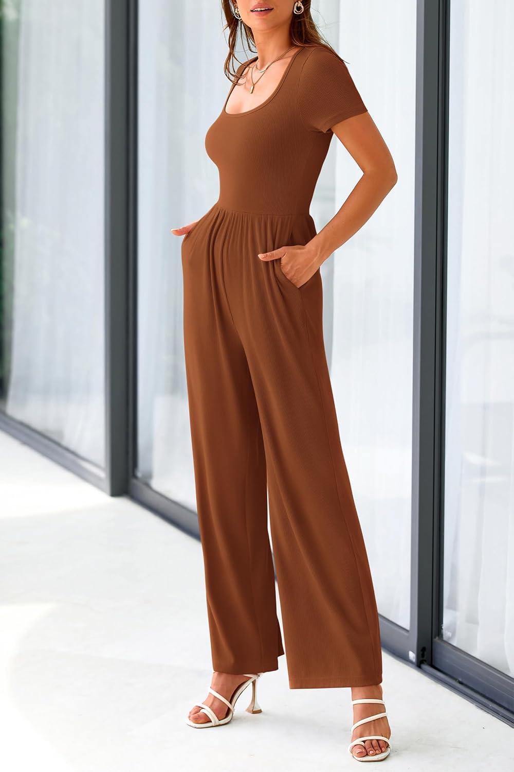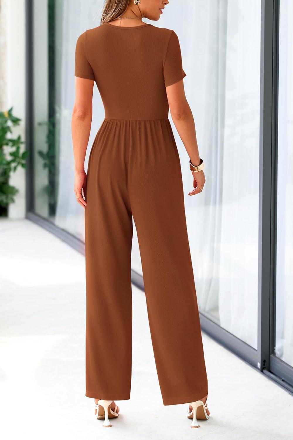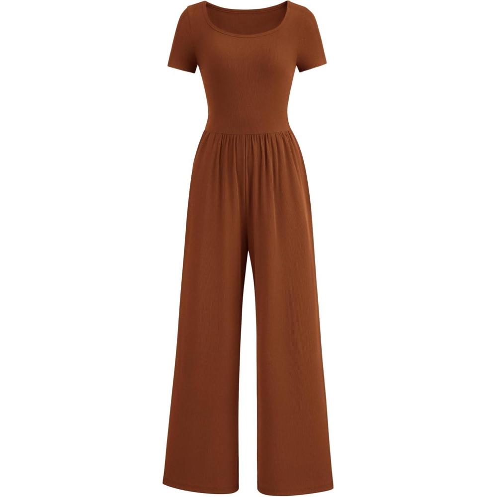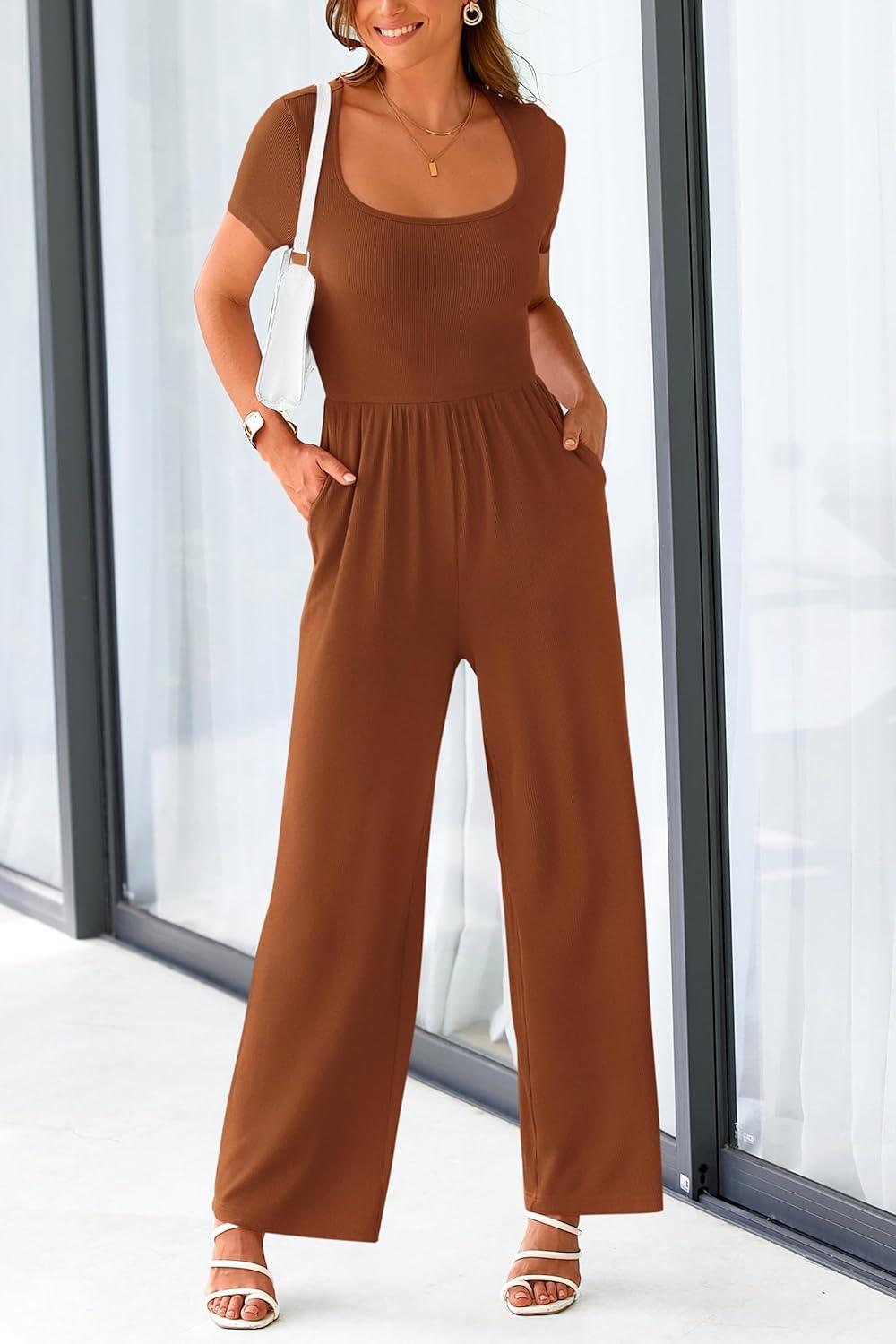 PRETTYGARDEN Women’s Summer One Piece Jumpsuits Dressy Casual Short Sleeve Square Neck Wide Leg Jumpsuit Rompers(Brown)