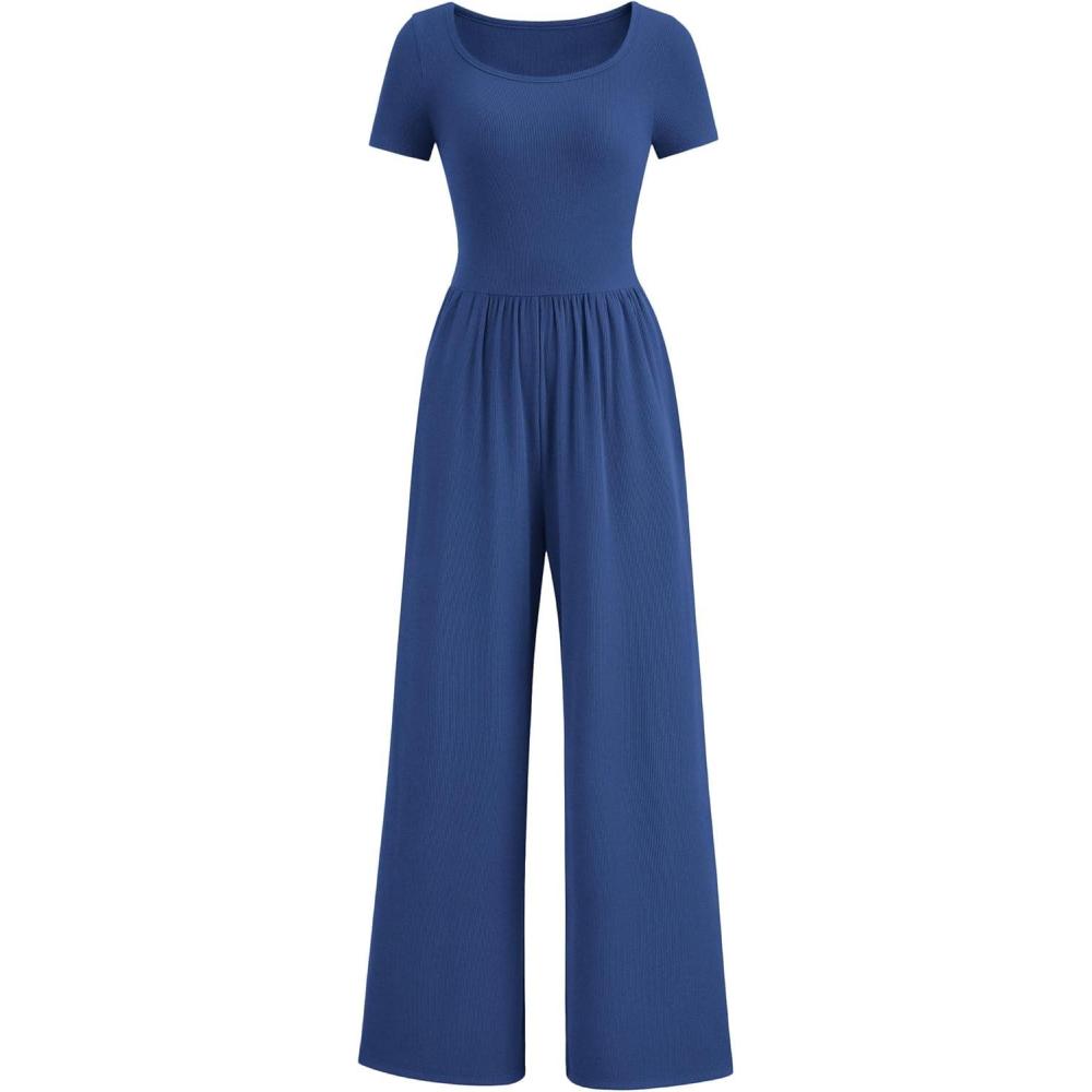 imagePRETTYGARDEN Womens Summer One Piece Jumpsuits Dressy Casual Short Sleeve Square Neck Wide Leg Jumpsuit RompersDark Blue