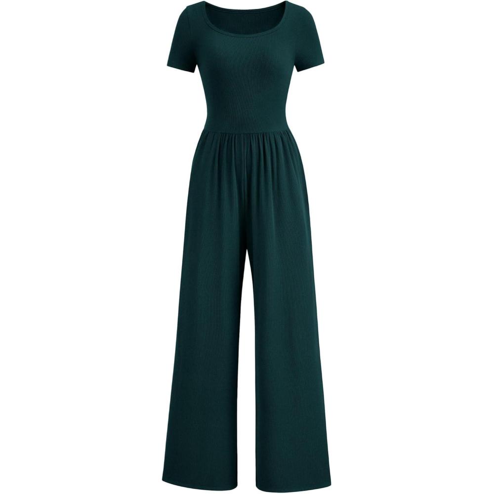 PRETTYGARDEN Women’s Summer One Piece Jumpsuits Dressy Casual Short Sleeve Square Neck Wide Leg Jumpsuit Rompers(Dark Green)