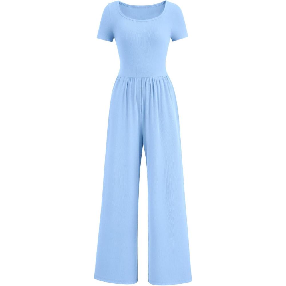 PRETTYGARDEN Women’s Summer One Piece Jumpsuits Dressy Casual Short Sleeve Square Neck Wide Leg Jumpsuit Rompers(Light Blue)