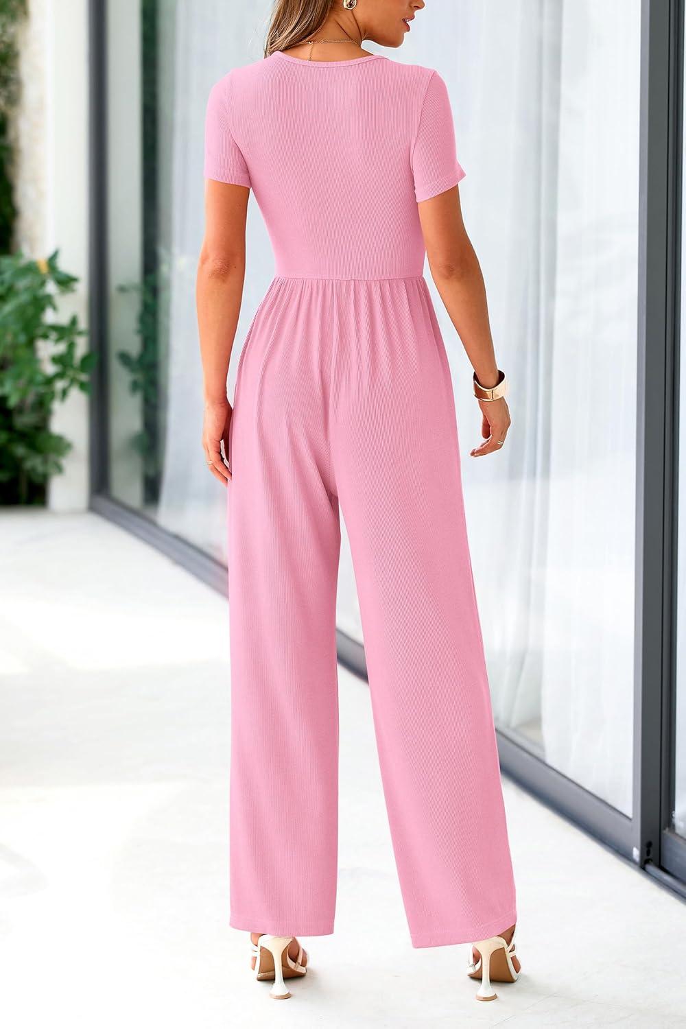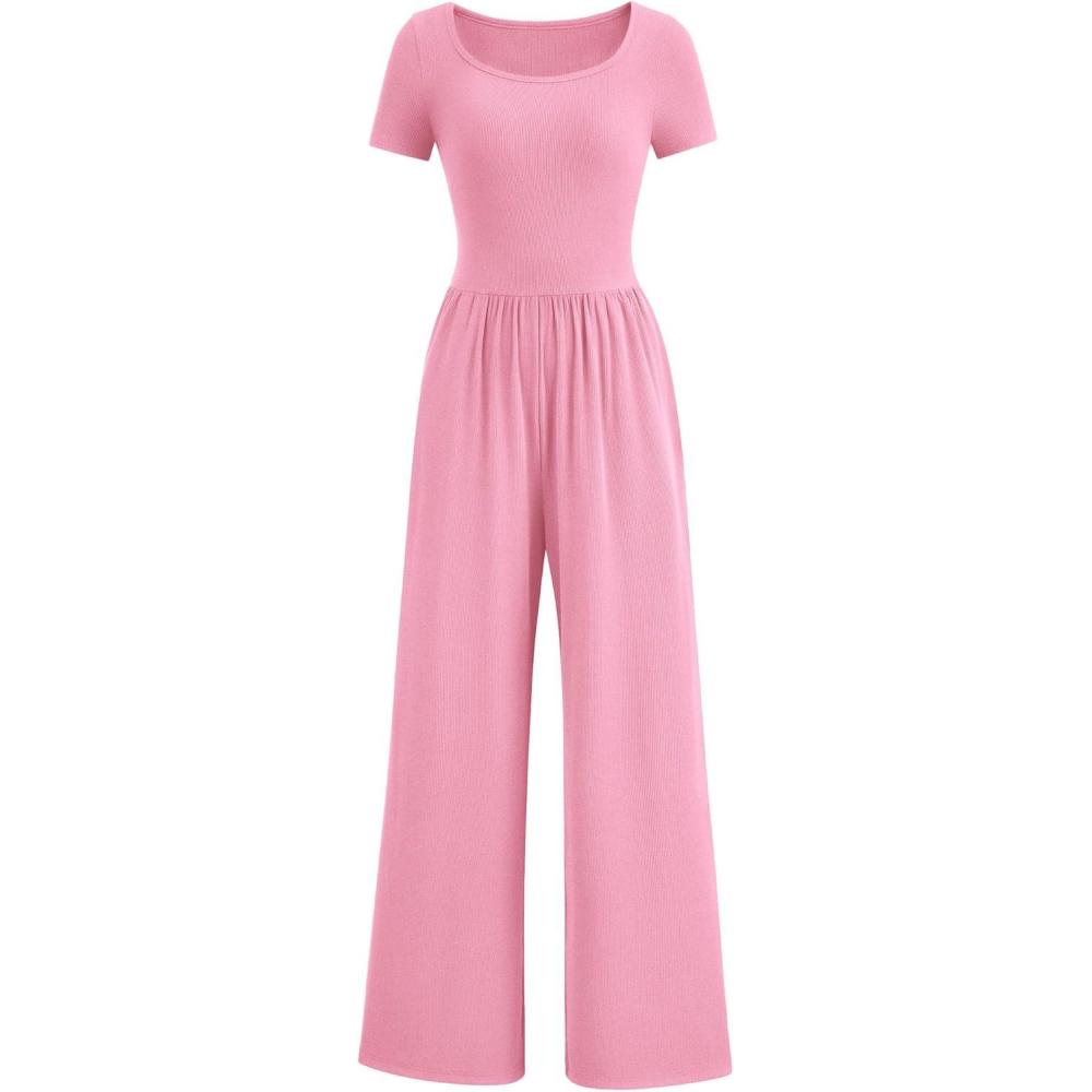 imagePRETTYGARDEN Womens Summer One Piece Jumpsuits Dressy Casual Short Sleeve Square Neck Wide Leg Jumpsuit RompersLight Pink