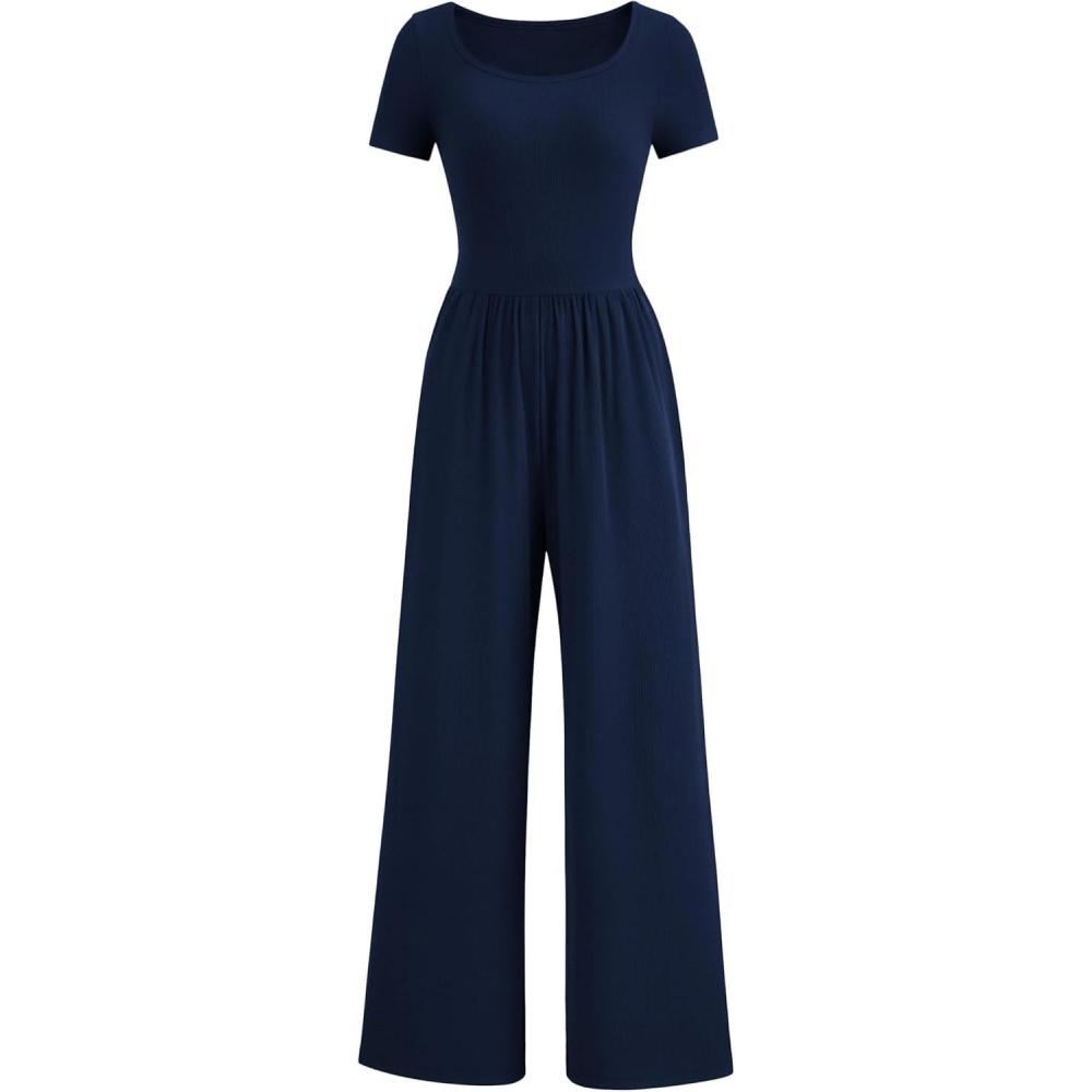 PRETTYGARDEN Women's Summer One Piece Jumpsuits Dressy Casual Short Sleeve Square Neck Wide Leg Jumpsuit Rompers(Navy)