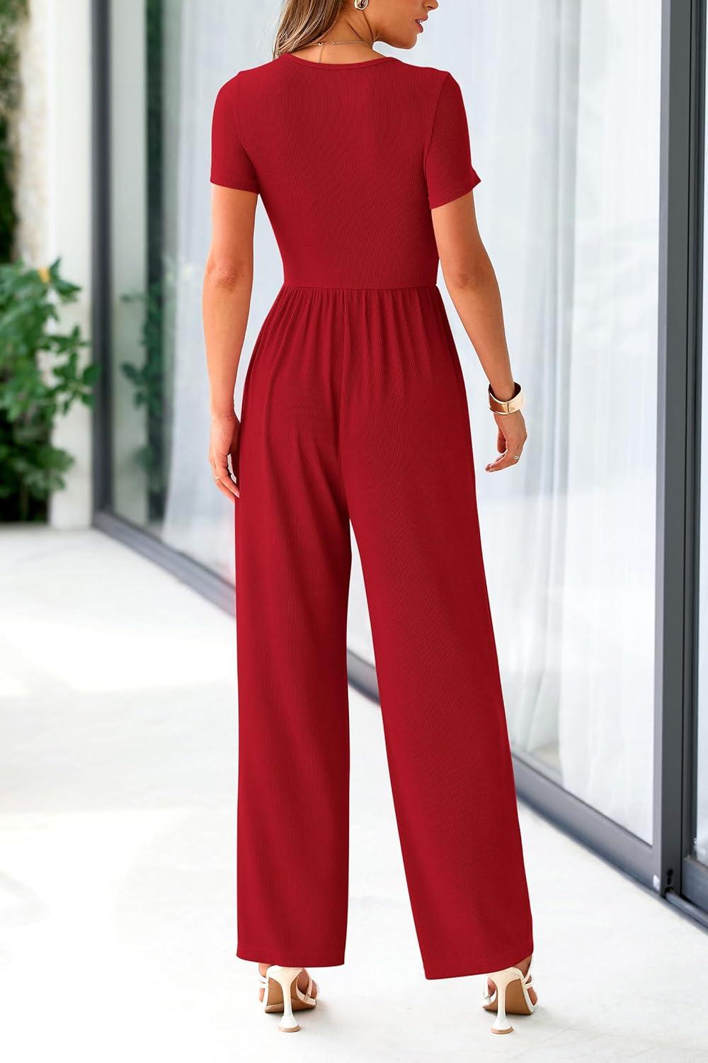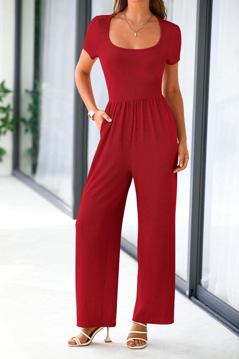 PRETTYGARDEN Women’s Summer One Piece Jumpsuits Dressy Casual Short Sleeve Square Neck Wide Leg Jumpsuit Rompers(Red)