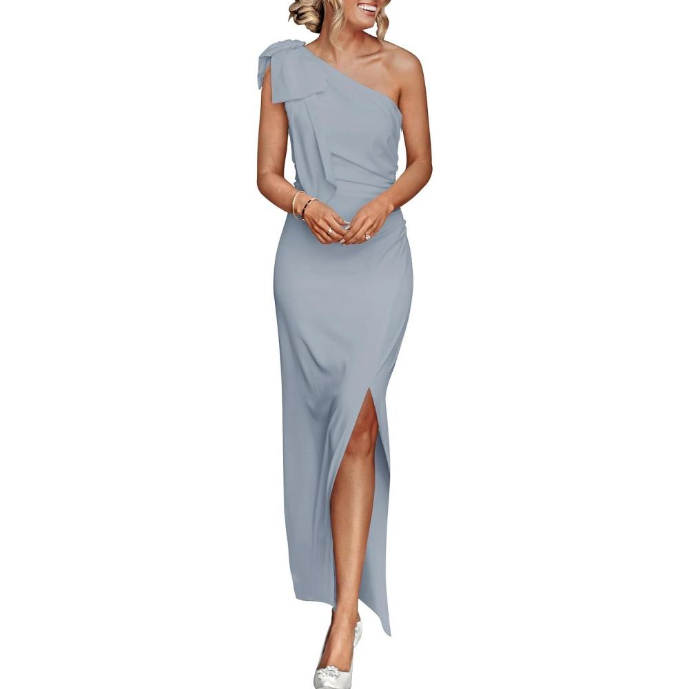 PRETTYGARDEN Women’s Summer One Shoulder Long Formal Dresses Sleeveless Ruched Bodycon Wedding Guest Slit Maxi Dress(Grey Blue)
