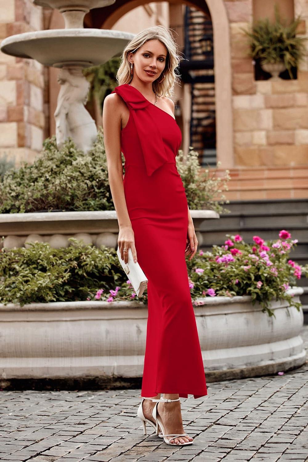 PRETTYGARDEN Women’s Summer One Shoulder Long Formal Dresses Sleeveless Ruched Bodycon Wedding Guest Slit Maxi Dress(Red)