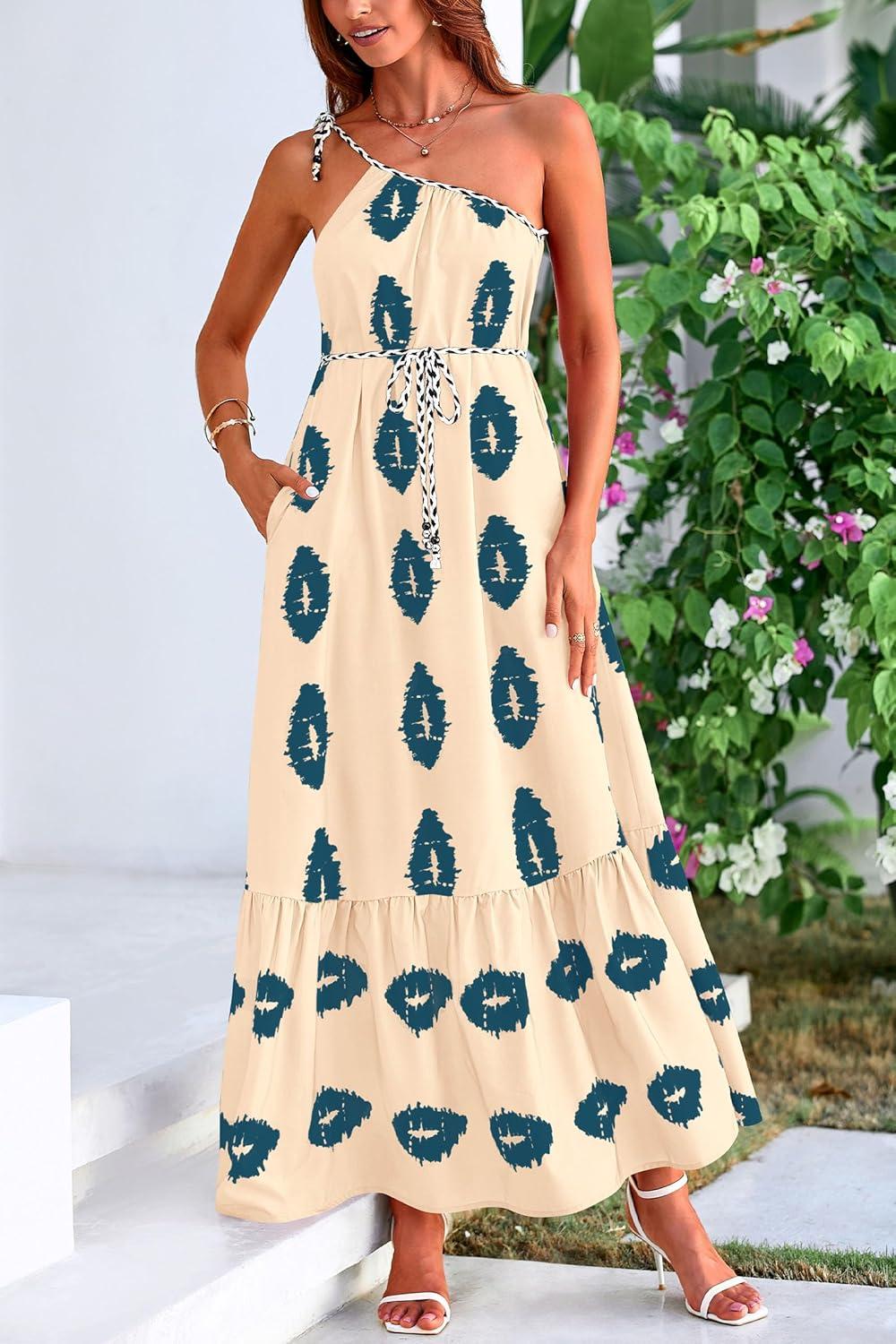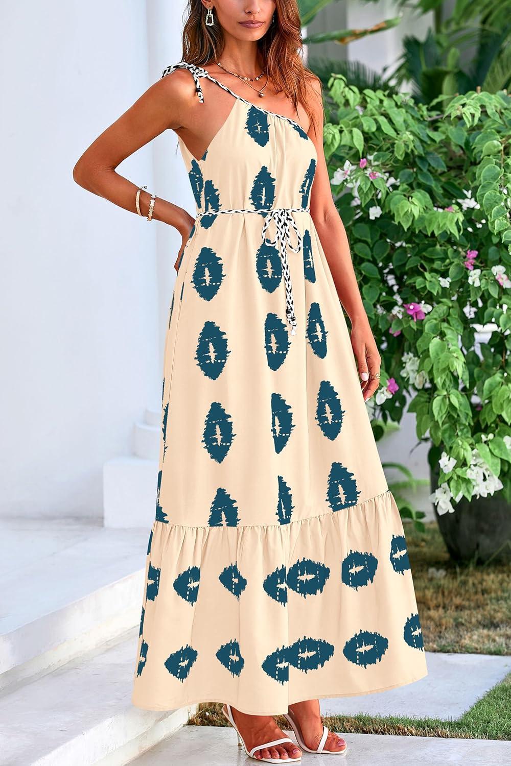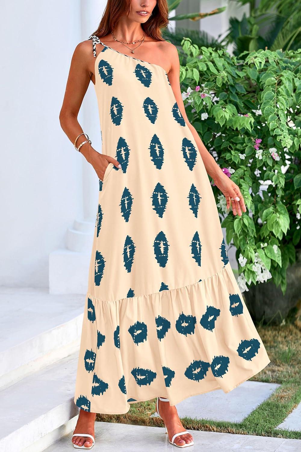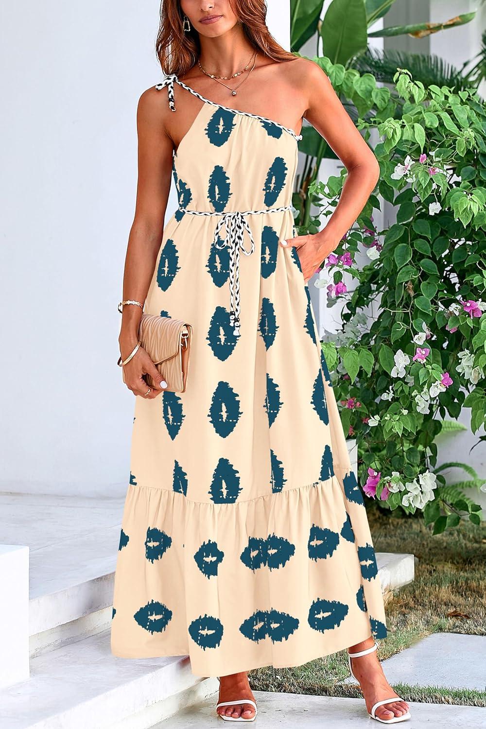 PRETTYGARDEN Women's Summer One Shoulder Maxi Dresses Printed Flowy Boho Beach Vacation Long Sundress(Apricot Blue Floral)