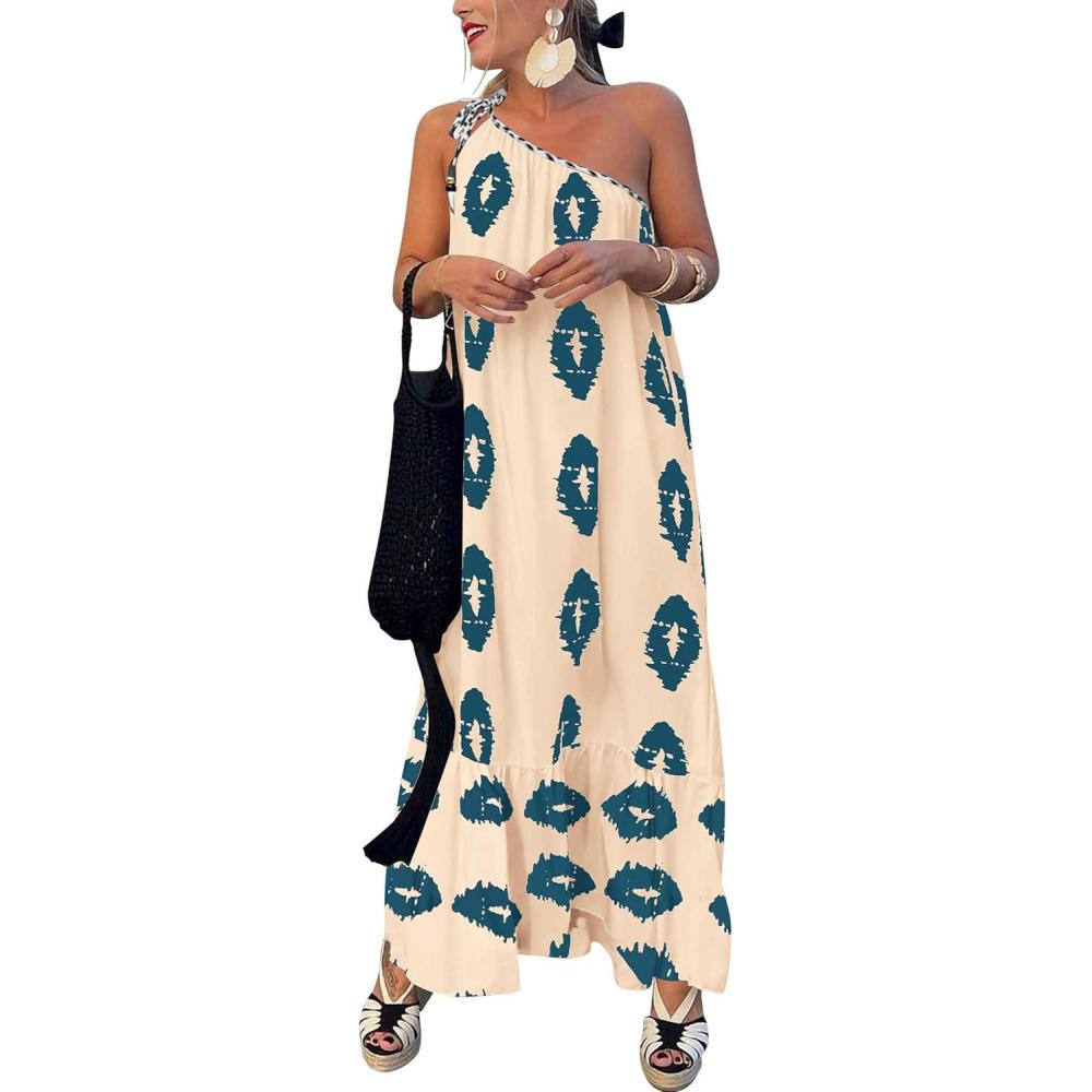 imagePRETTYGARDEN Womens Summer One Shoulder Maxi Dresses Printed Flowy Boho Beach Vacation Long SundressApricot Blue Floral
