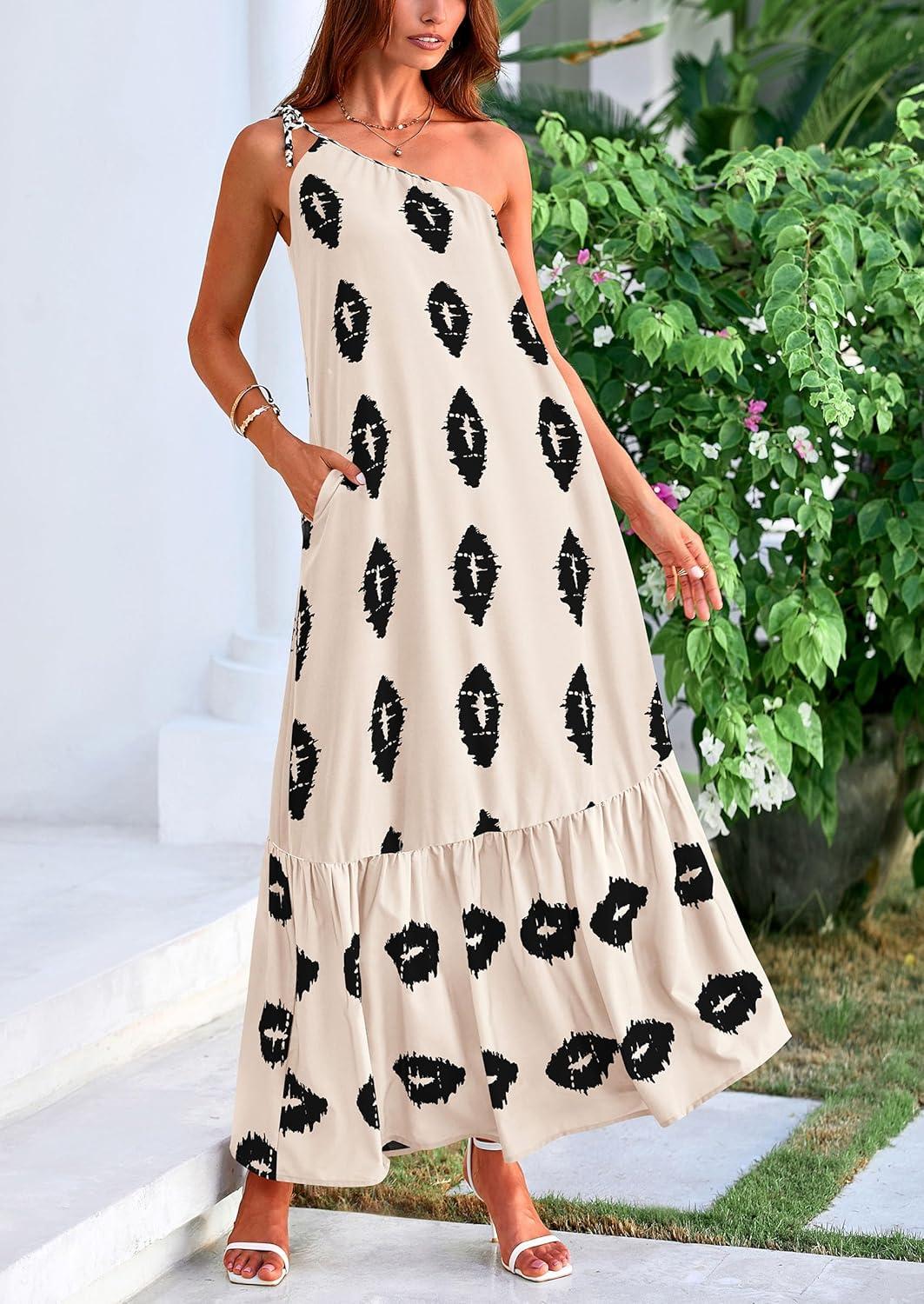 PRETTYGARDEN Women's Summer One Shoulder Maxi Dresses Printed Flowy Boho Beach Vacation Long Sundress(Beige Black Floral)