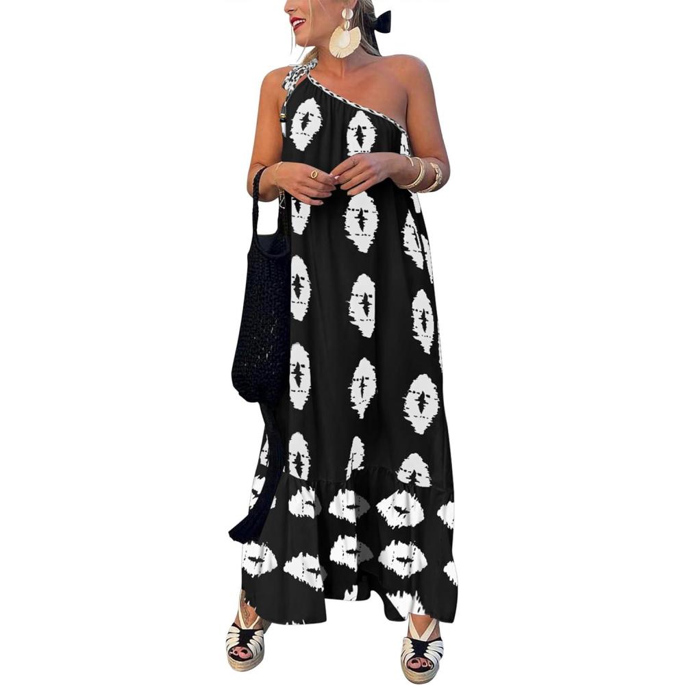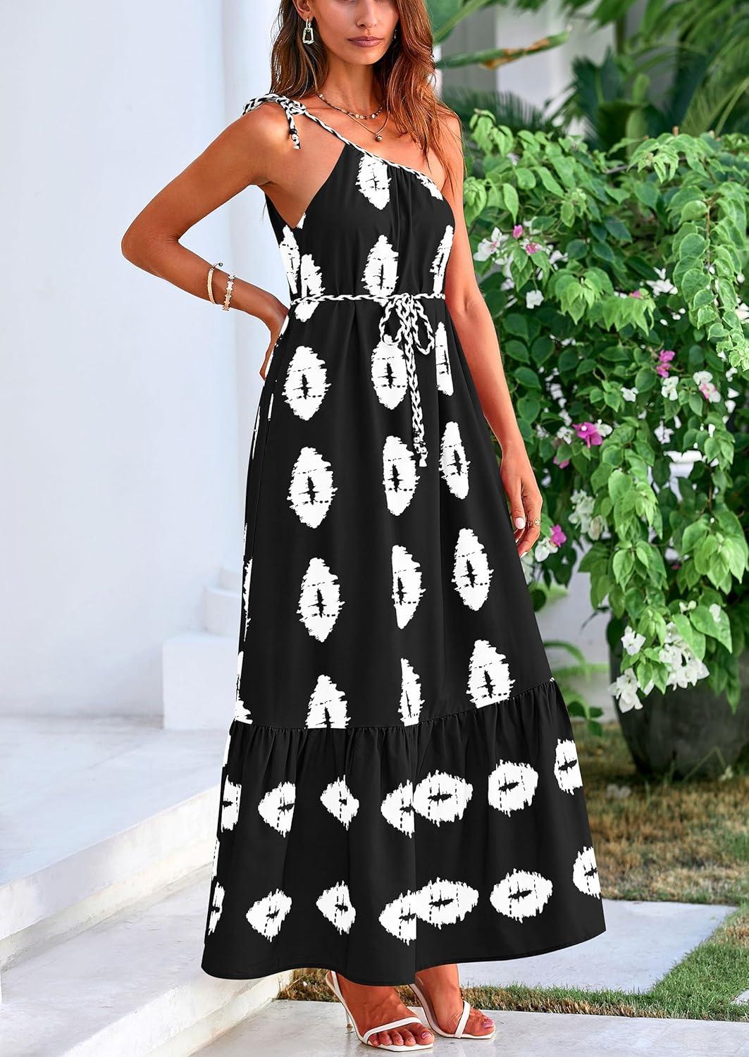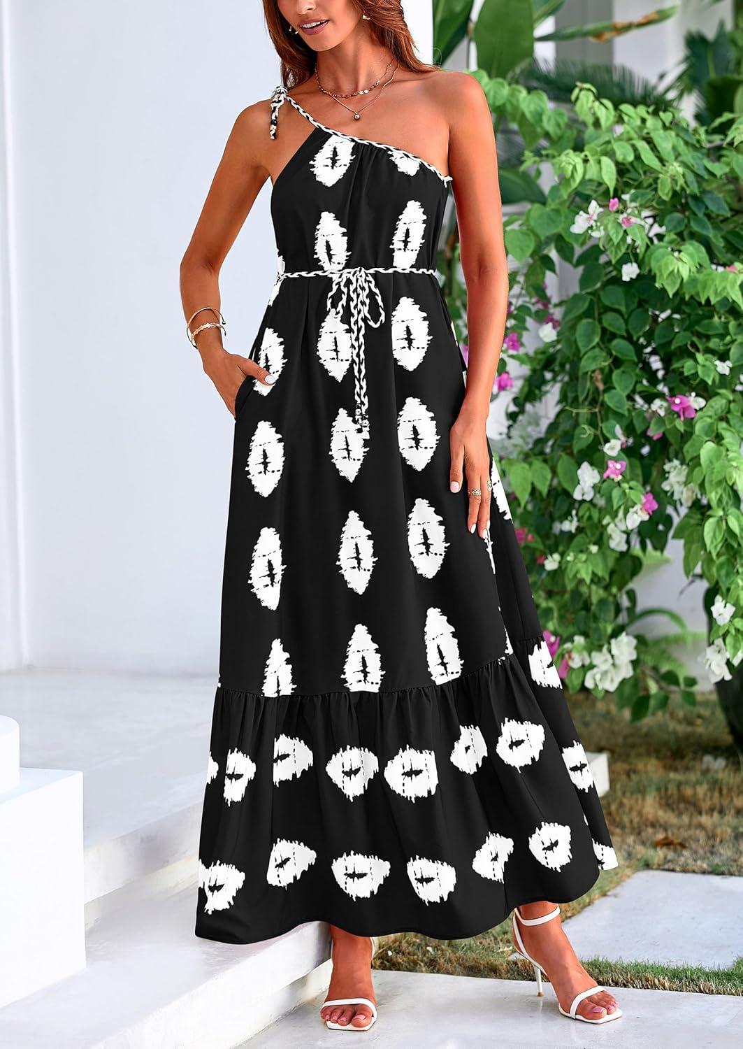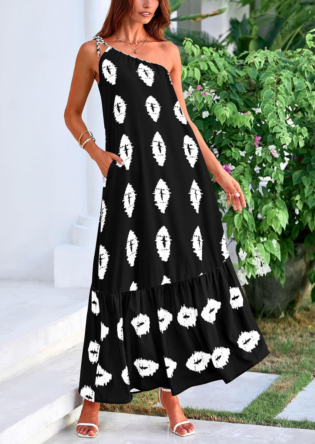 PRETTYGARDEN Women’s Summer One Shoulder Maxi Dresses Printed Flowy Boho Beach Vacation Long Sundress(Black White Floral)