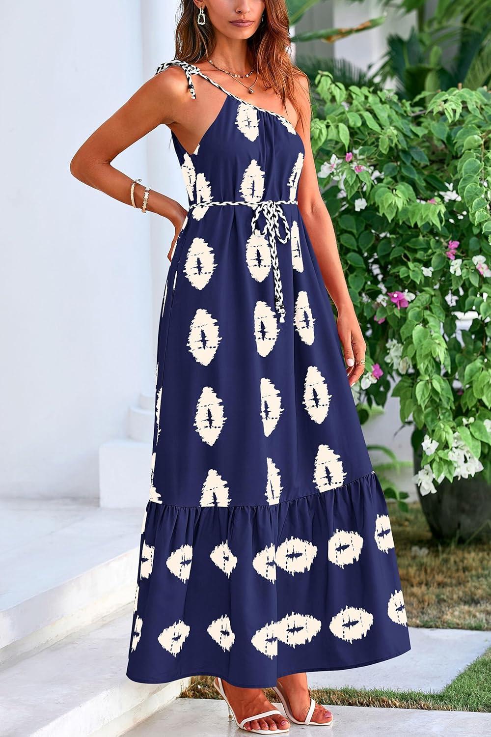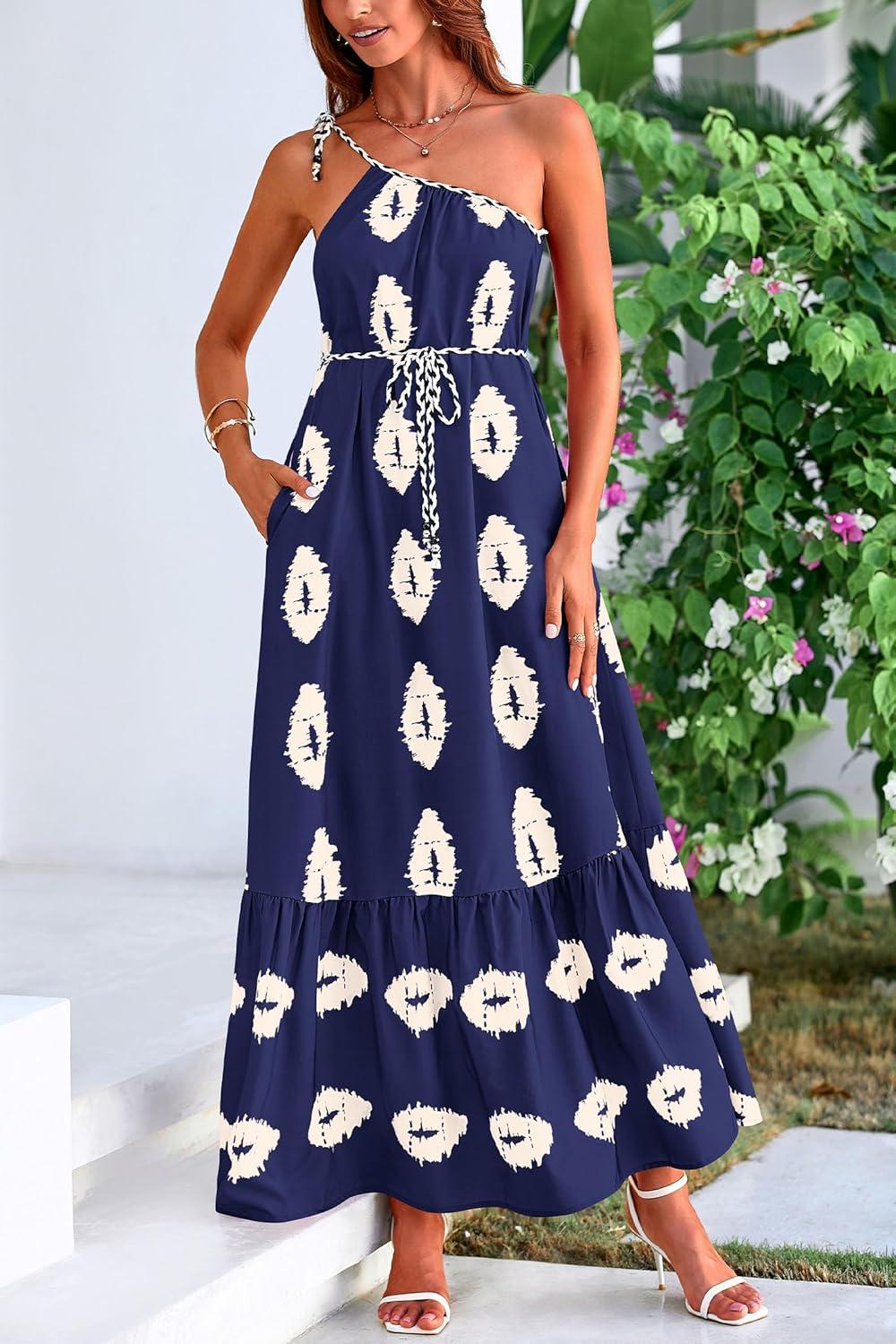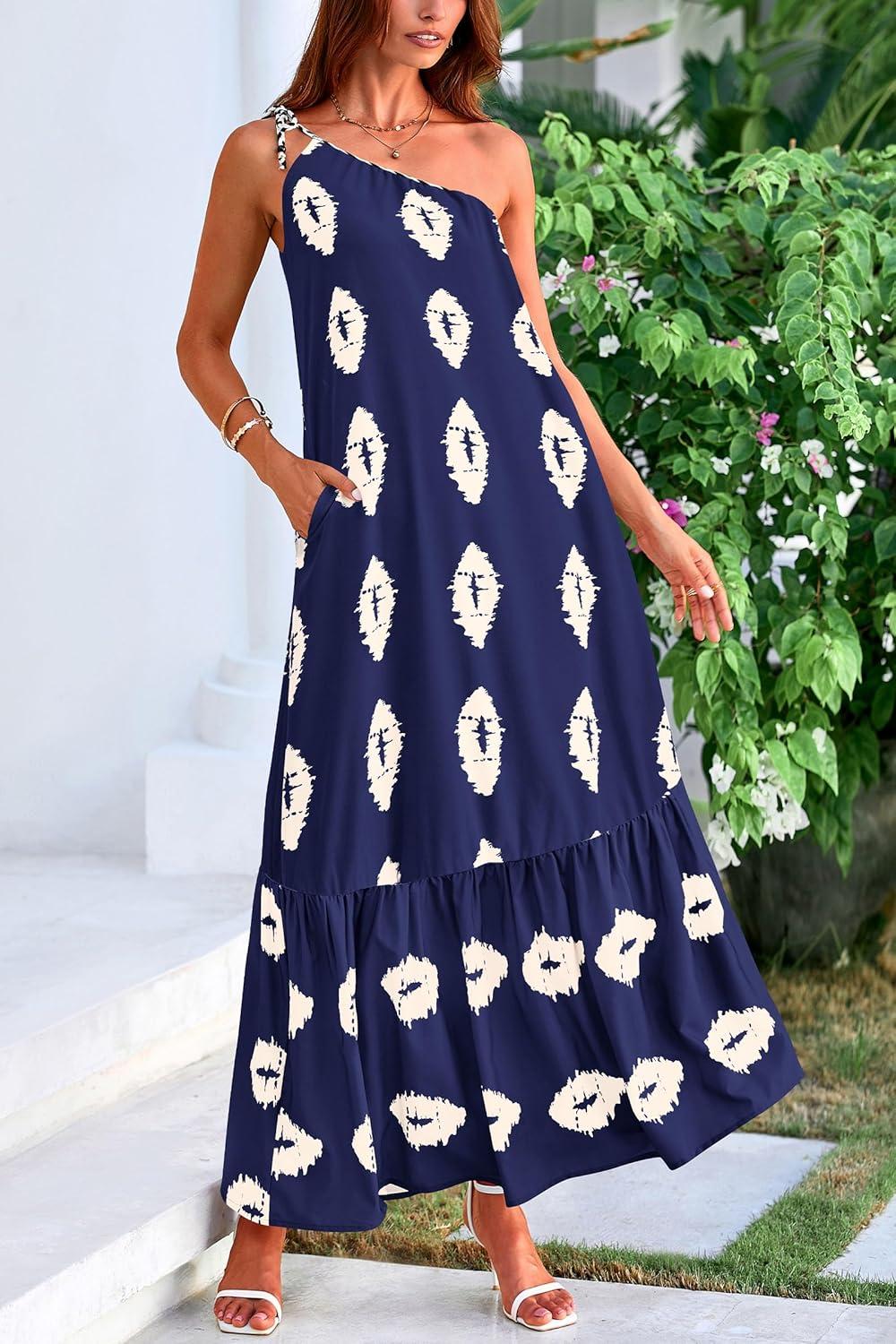 PRETTYGARDEN Women's Summer One Shoulder Maxi Dresses Printed Flowy Boho Beach Vacation Long Sundress(Navy Apricot Floral)