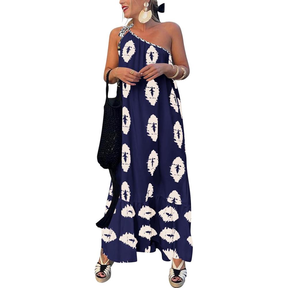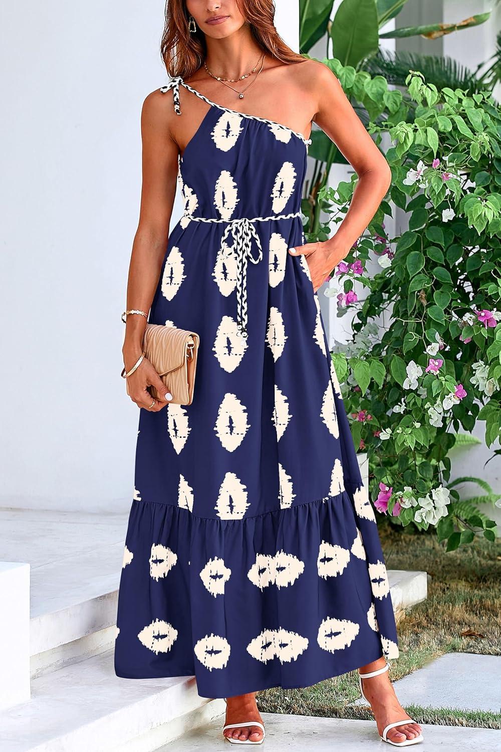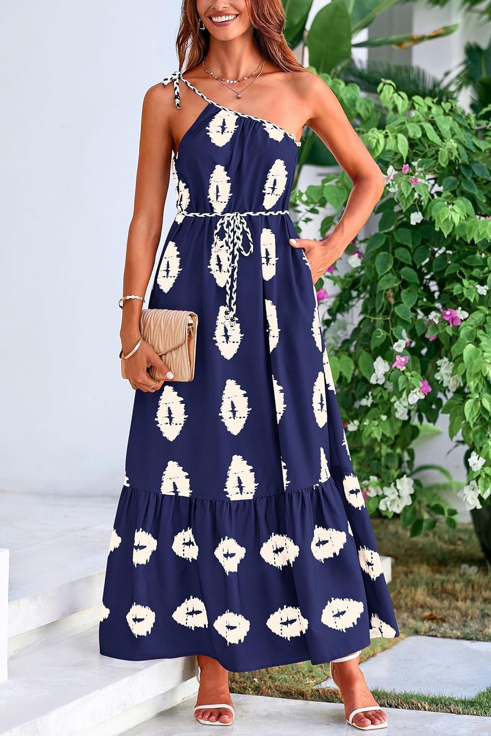 PRETTYGARDEN Women's Summer One Shoulder Maxi Dresses Printed Flowy Boho Beach Vacation Long Sundress(Navy Apricot Floral)