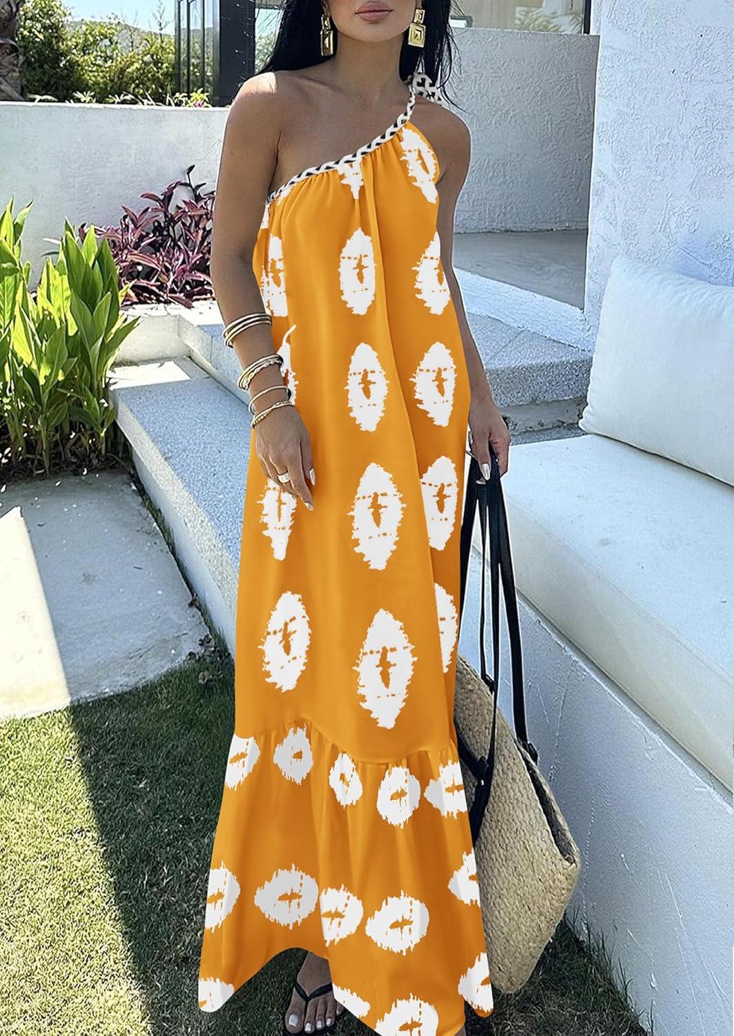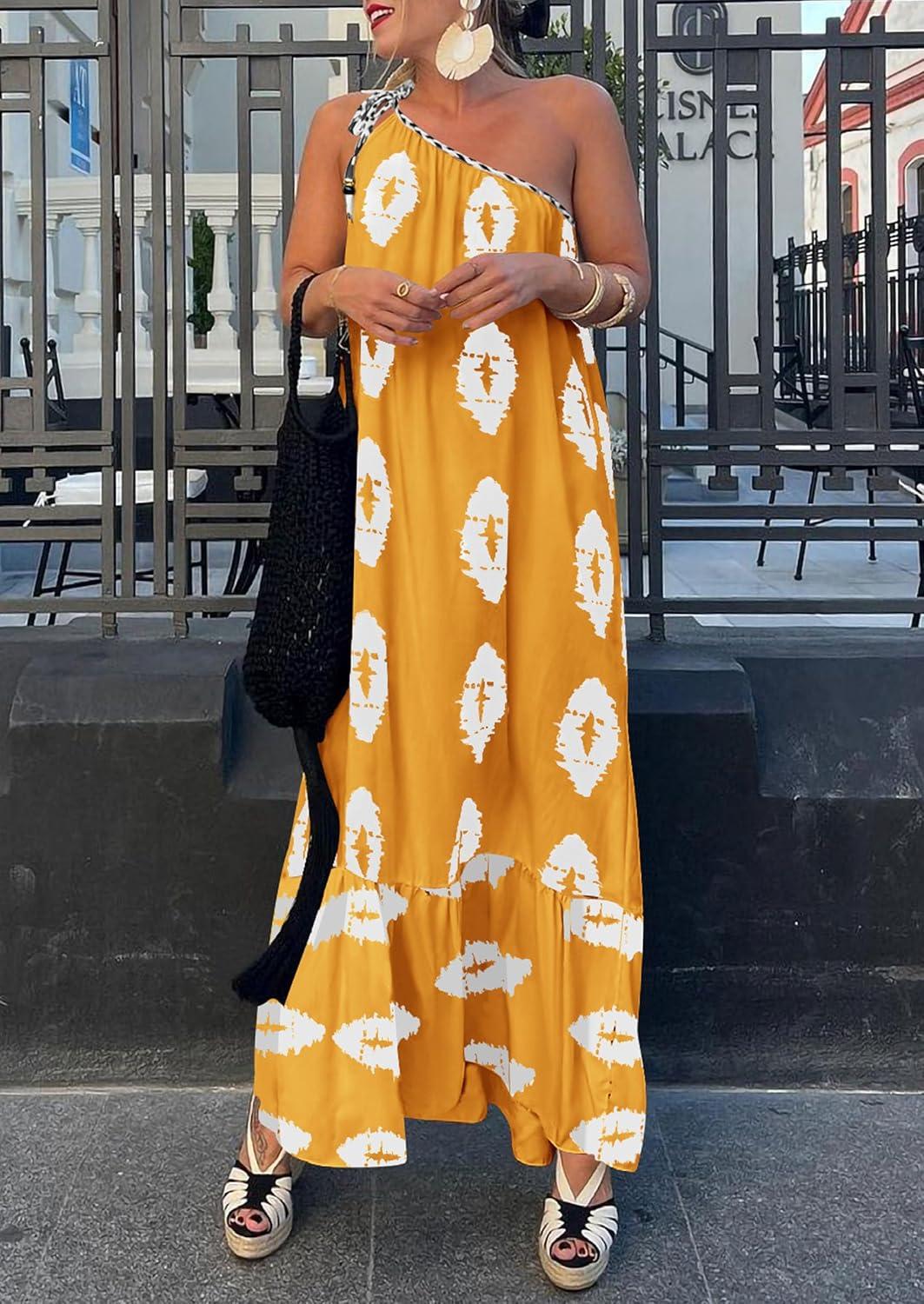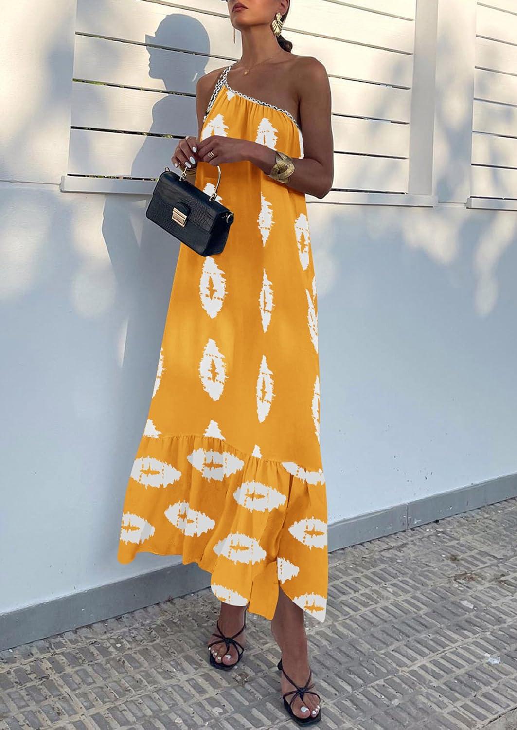 PRETTYGARDEN Women's Summer One Shoulder Maxi Dresses Printed Flowy Boho Beach Vacation Long Sundress(Turmeric White Floral)