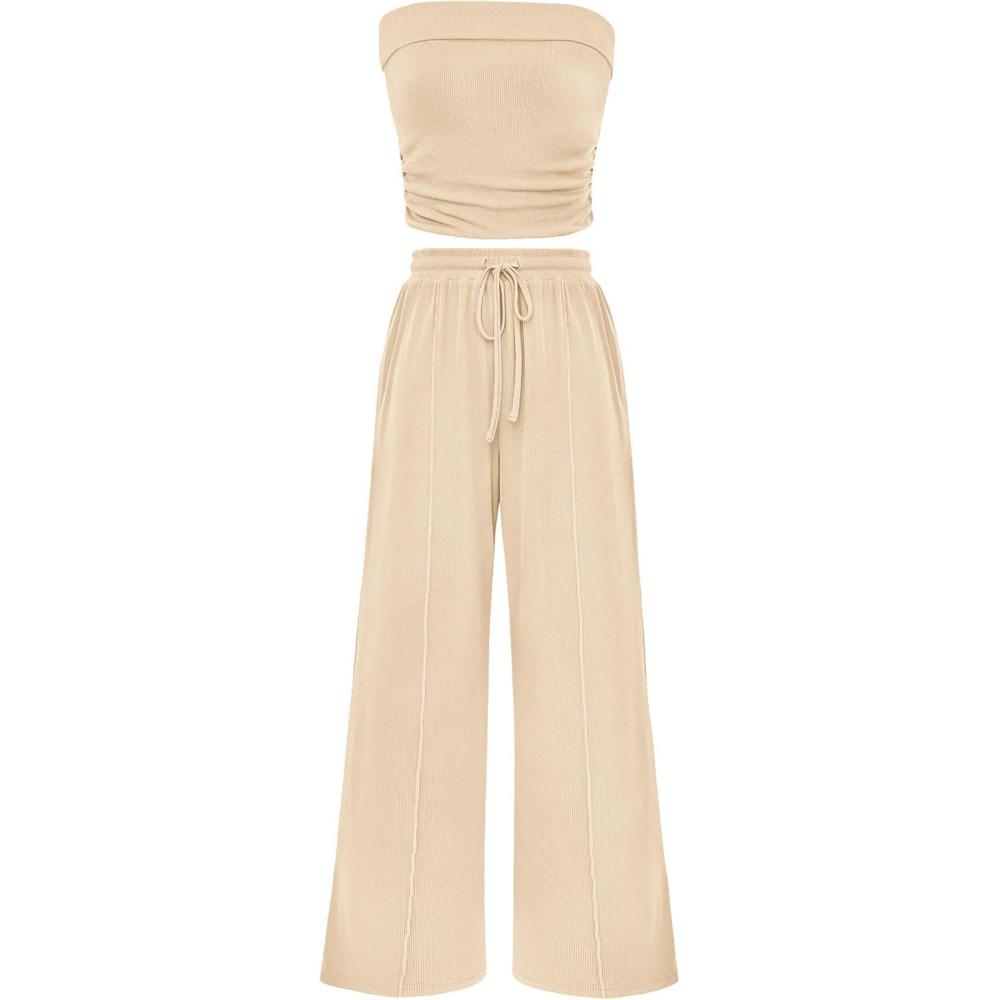PRETTYGARDEN Womens Summer Outfits 2 Piece Sets Casual Ribbed Knit Crop Tube Top Wide Leg Pants Spring Matching Lounge Set(Apricot)