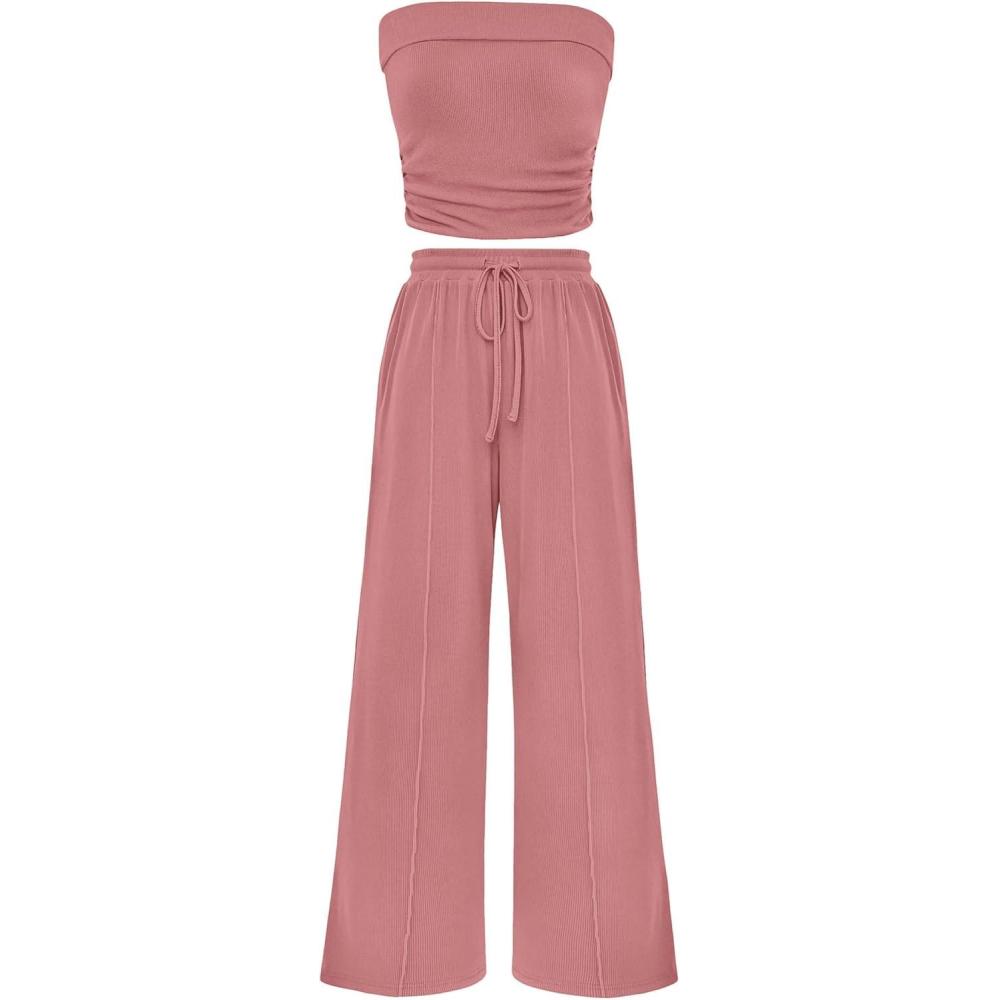 PRETTYGARDEN Womens Summer Outfits 2 Piece Sets Casual Ribbed Knit Crop Tube Top Wide Leg Pants Spring Matching Lounge Set(Dusty Pink)