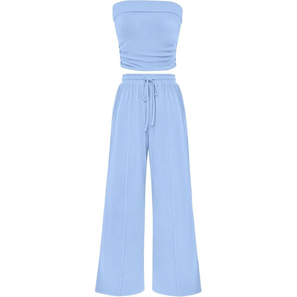 PRETTYGARDEN Womens Summer Outfits 2 Piece Sets Casual Ribbed Knit Crop Tube Top Wide Leg Pants Spring Matching Lounge Set(Light Blue)