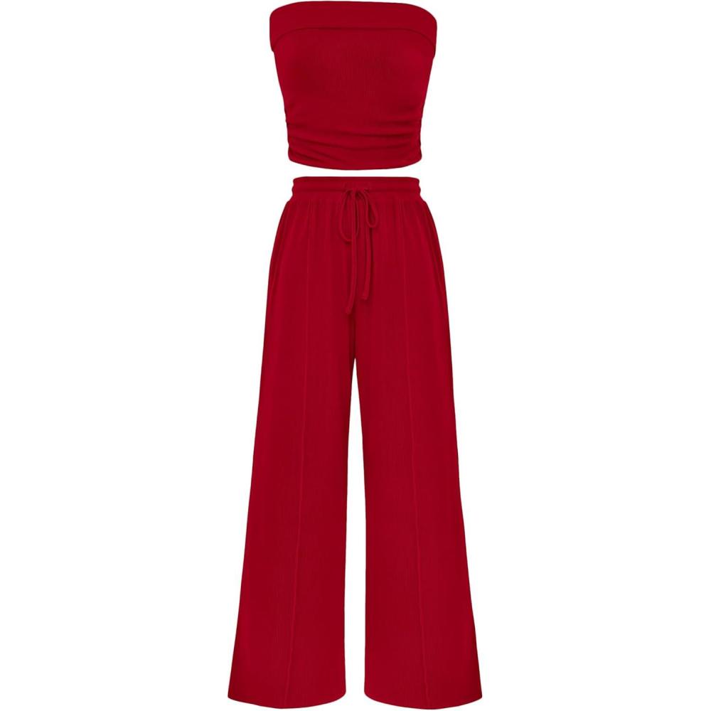 PRETTYGARDEN Womens Summer Outfits 2 Piece Sets Casual Ribbed Knit Crop Tube Top Wide Leg Pants Spring Matching Lounge Set(Red)