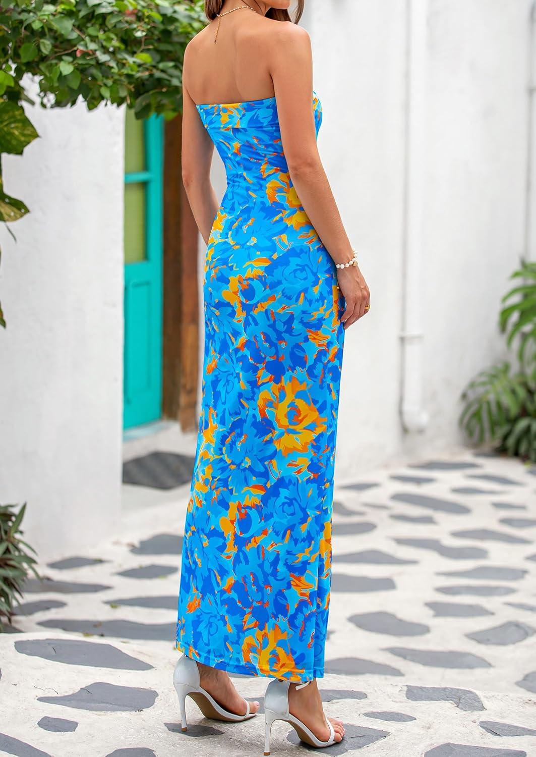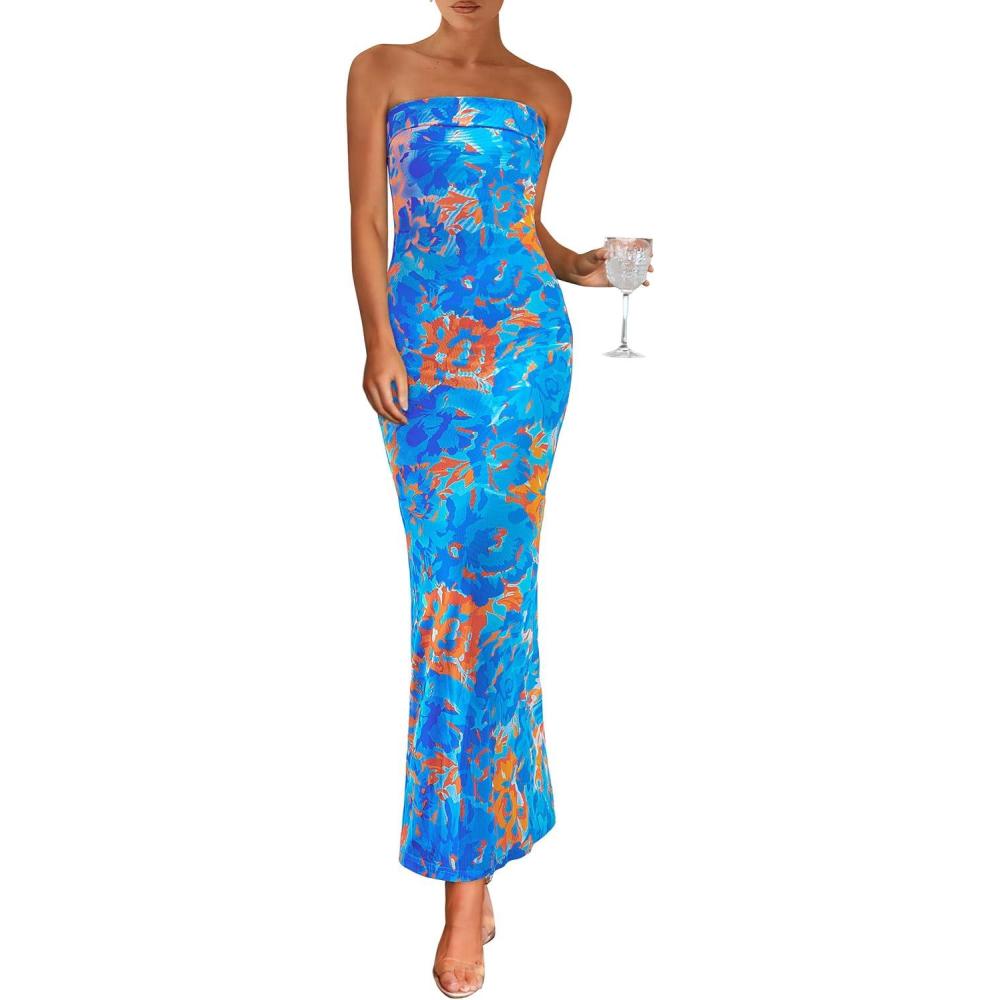 PRETTYGARDEN Womens Summer Printed Tube Maxi Dress Strapless Bodycon Sleeveless Night Out Long Dresses(Floral Light Blue)