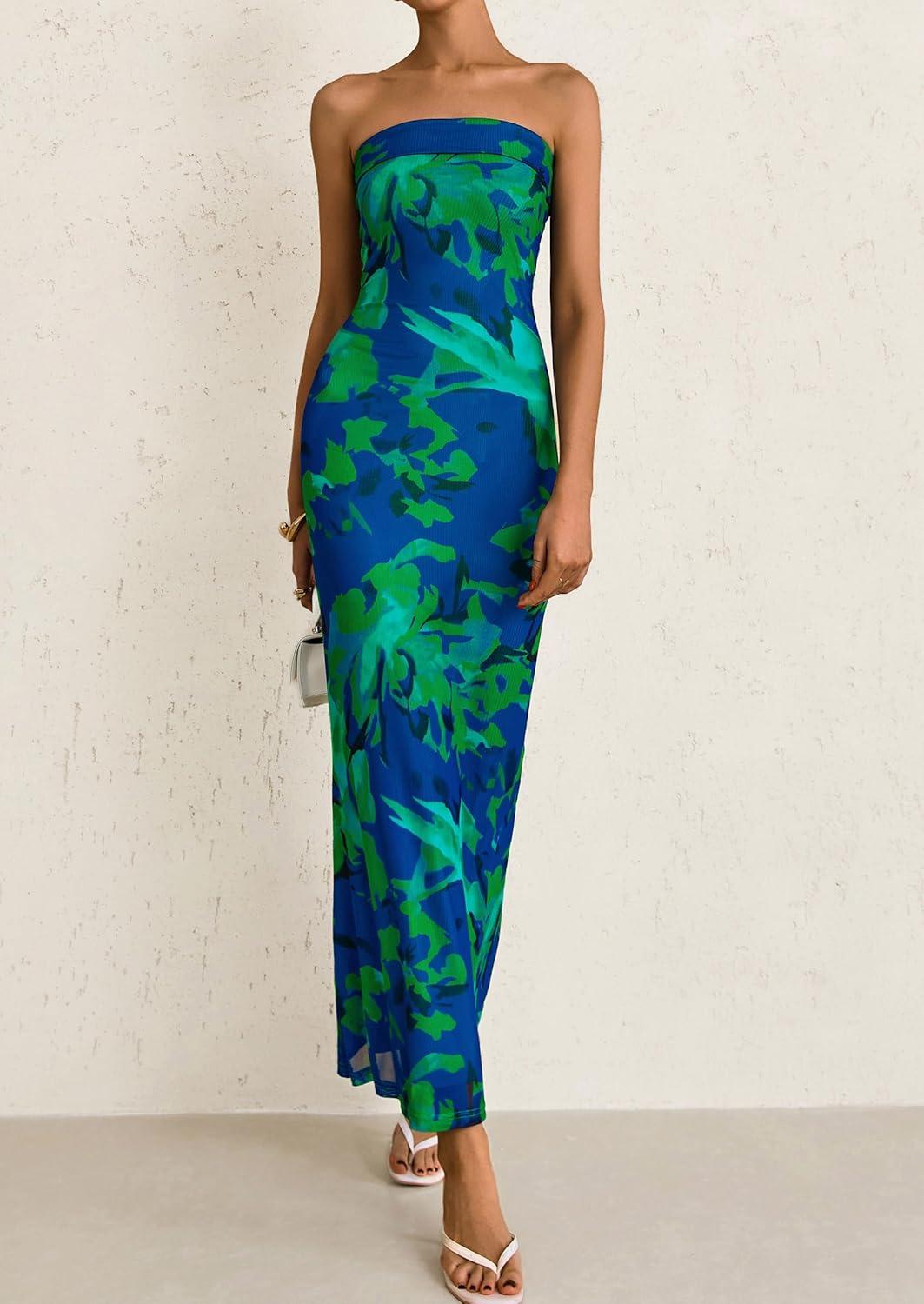 PRETTYGARDEN Womens Summer Printed Tube Maxi Dress Strapless Bodycon Sleeveless Night Out Long Dresses(Lake Blue Floral)