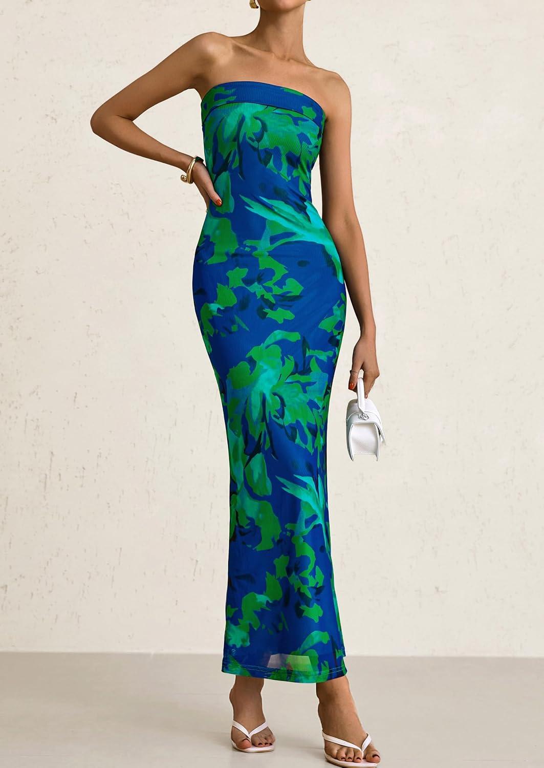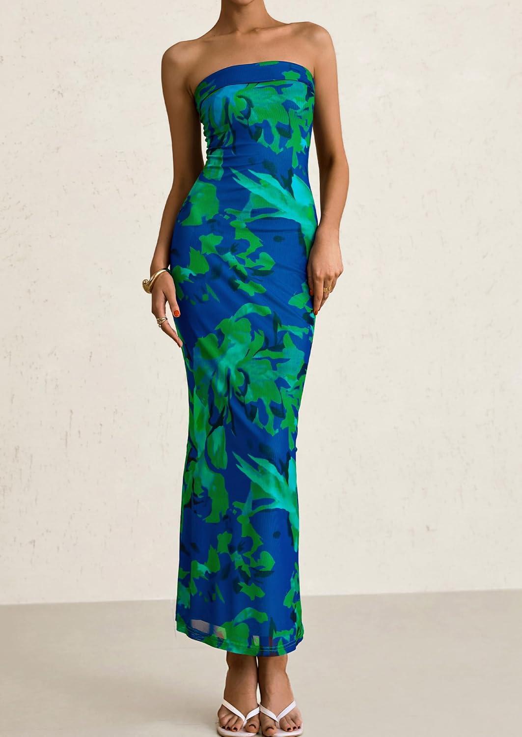 PRETTYGARDEN Womens Summer Printed Tube Maxi Dress Strapless Bodycon Sleeveless Night Out Long Dresses(Green Floral)
