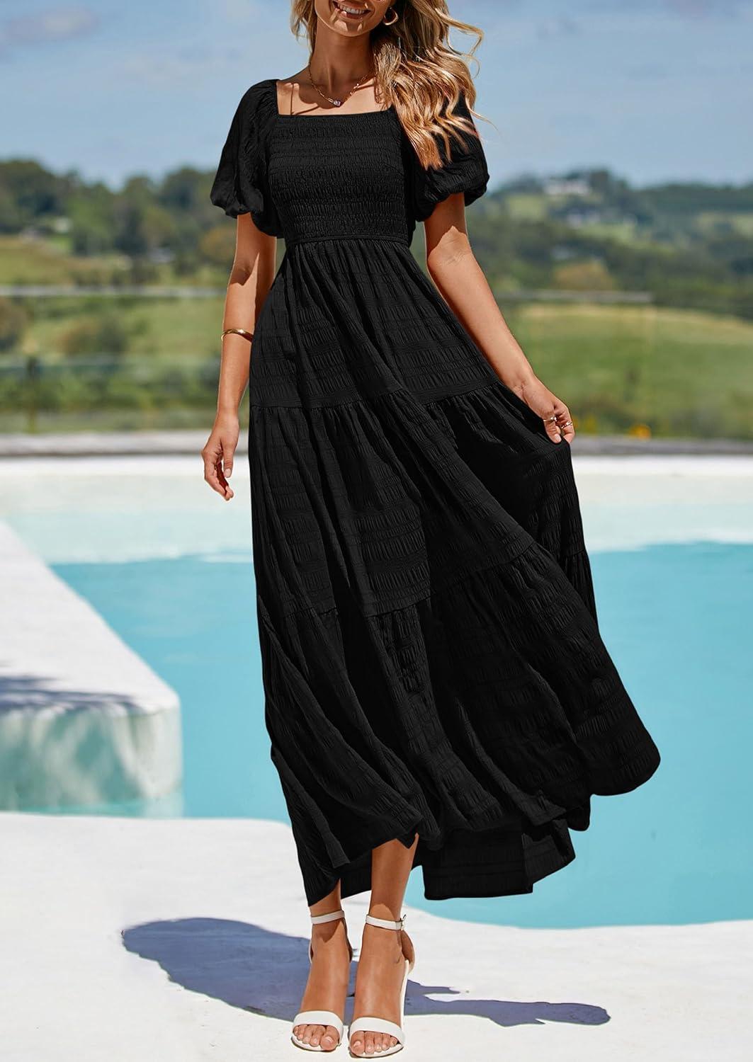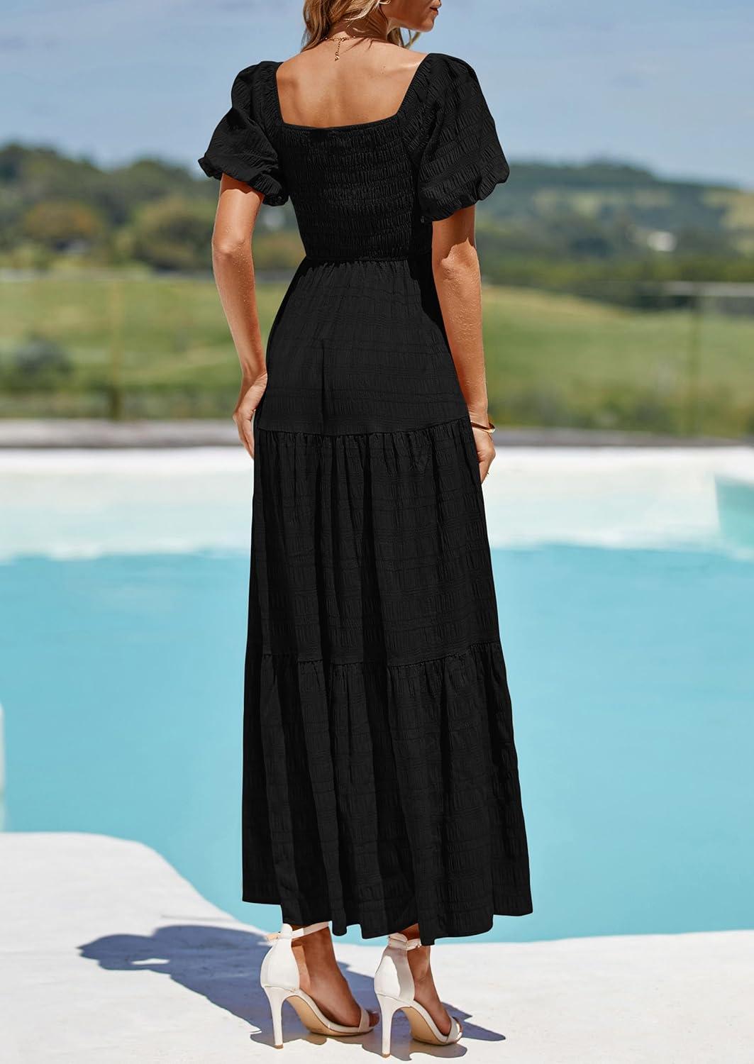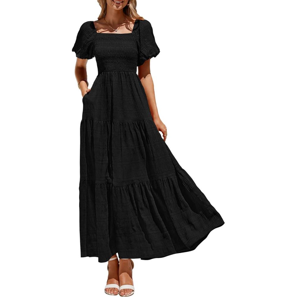 PRETTYGARDEN Womens Summer Puff Short Sleeve Maxi Dress Square Neck Smocked Tiered Ruffle A Line Long Flowy Beach Dresses(Black)