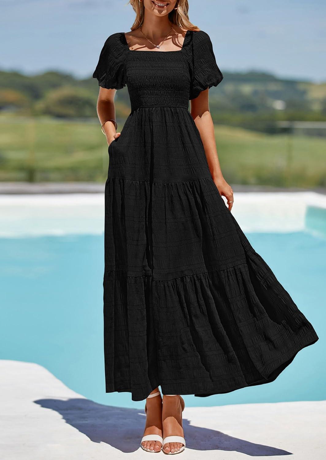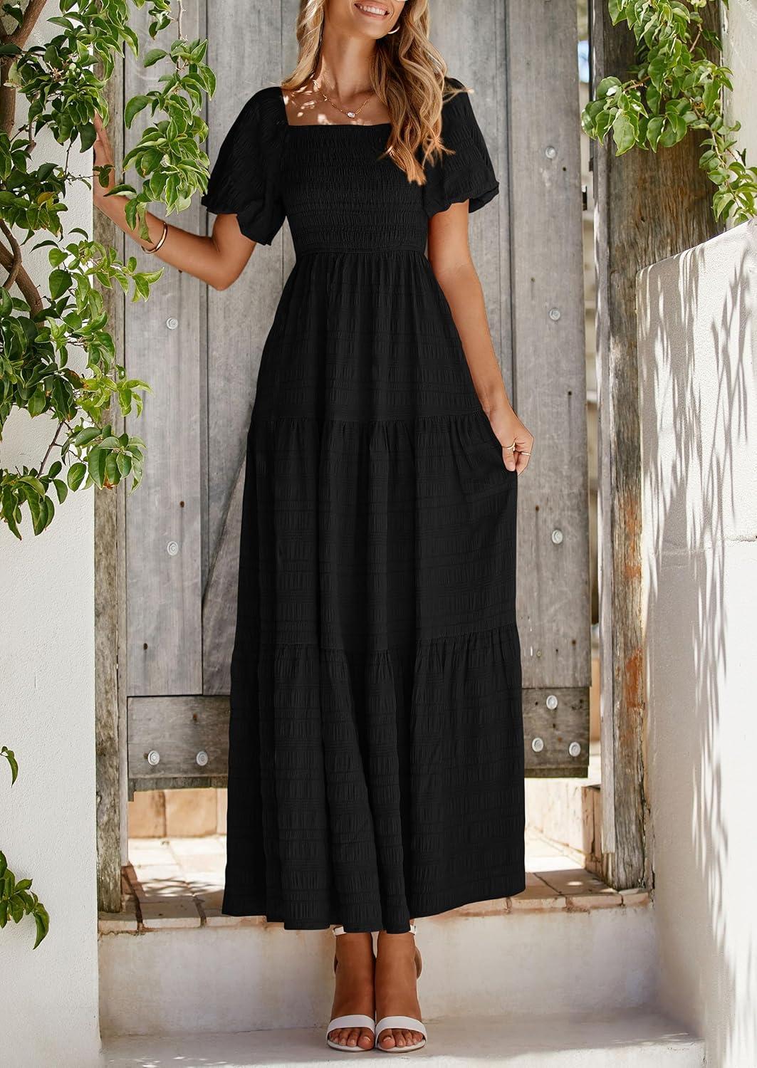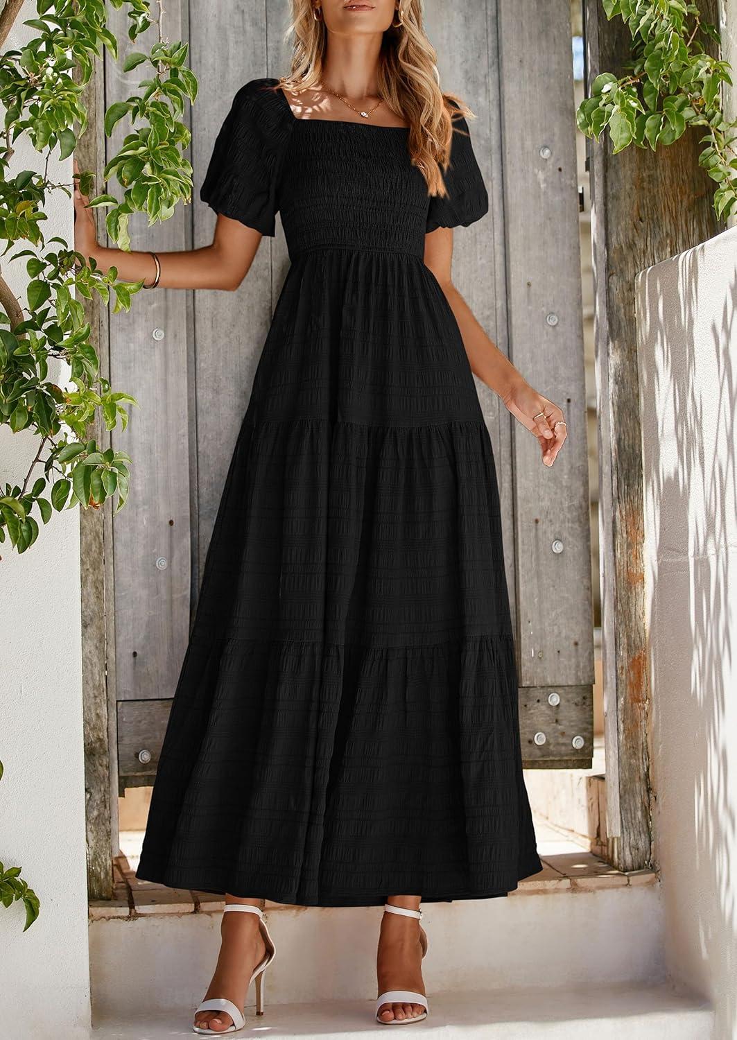 PRETTYGARDEN Womens Summer Puff Short Sleeve Maxi Dress Square Neck Smocked Tiered Ruffle A Line Long Flowy Beach Dresses(Black)