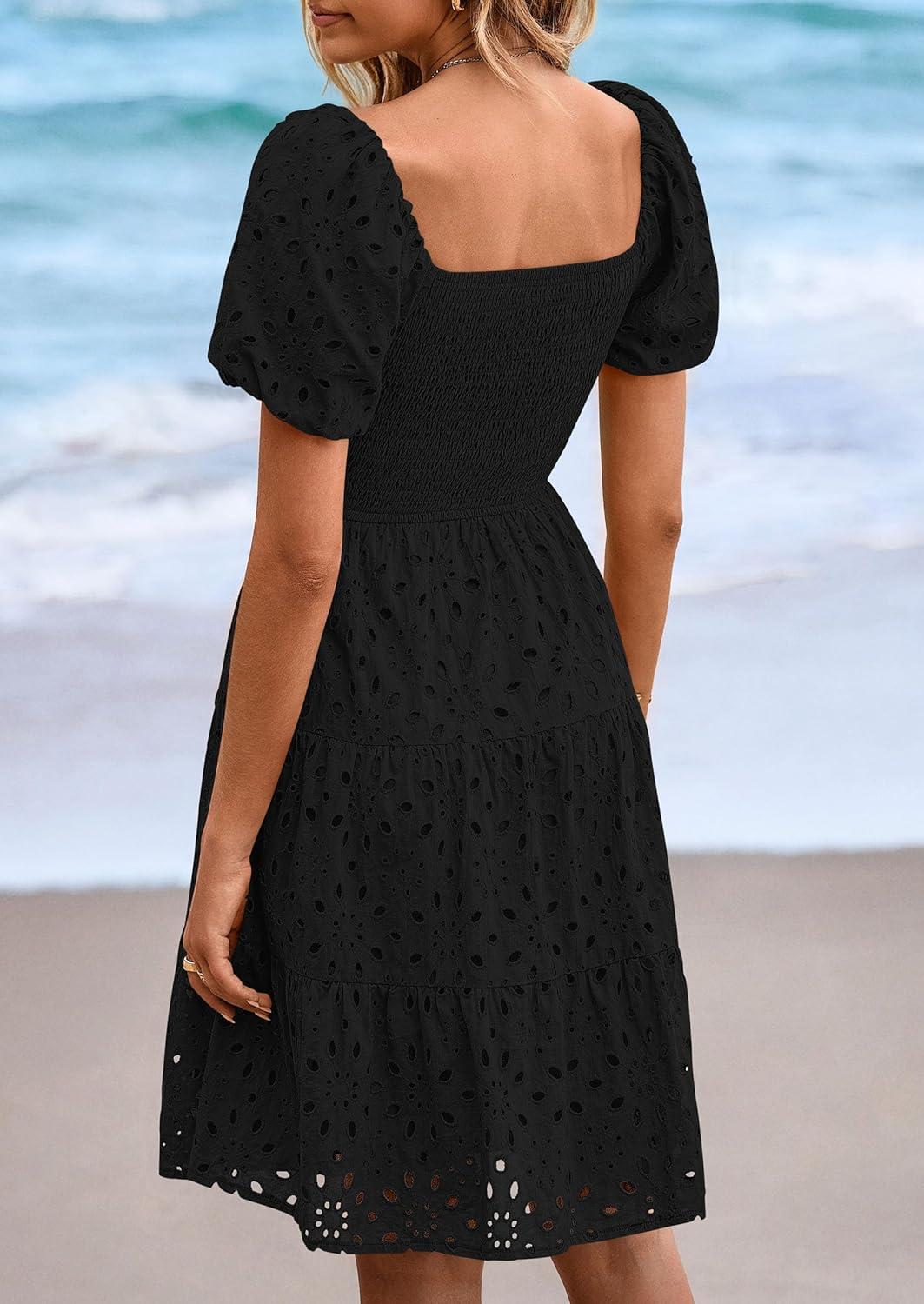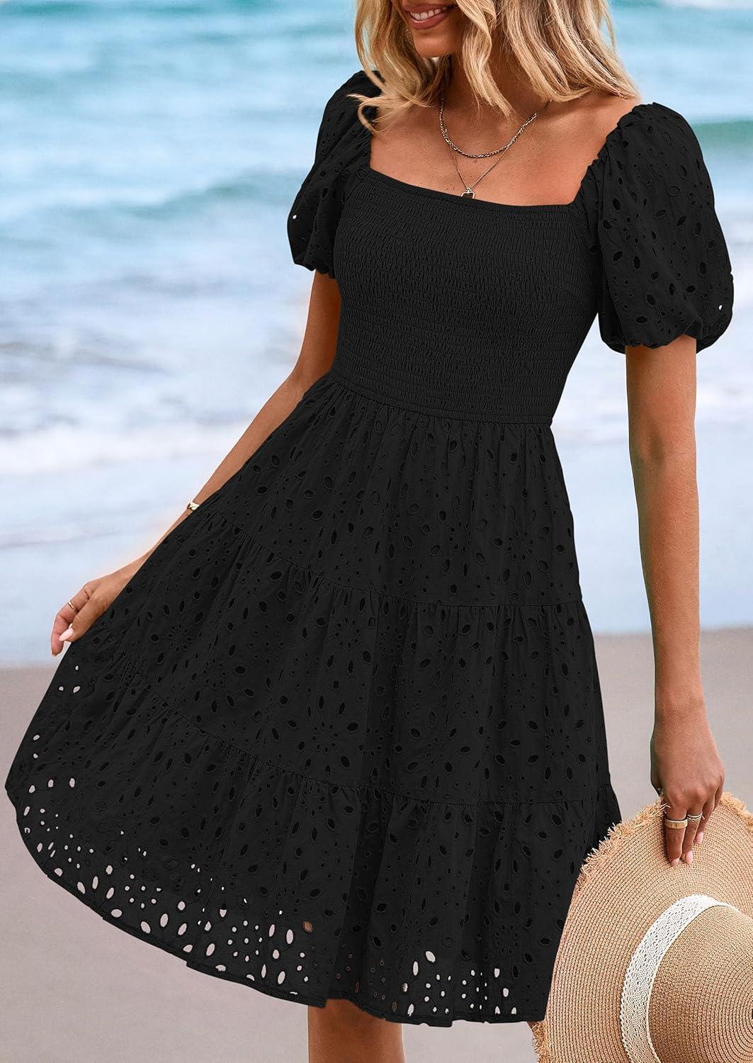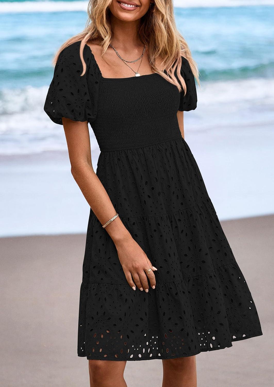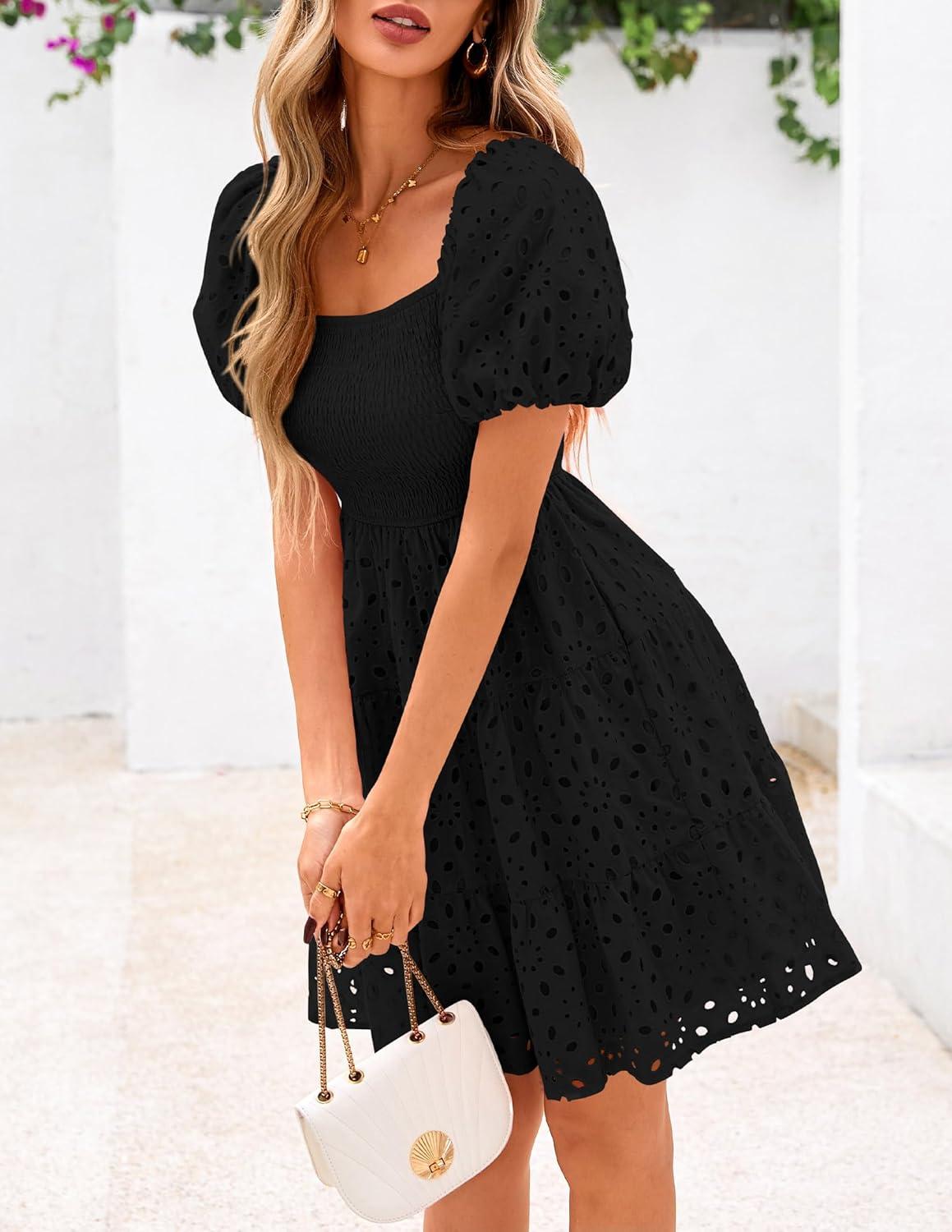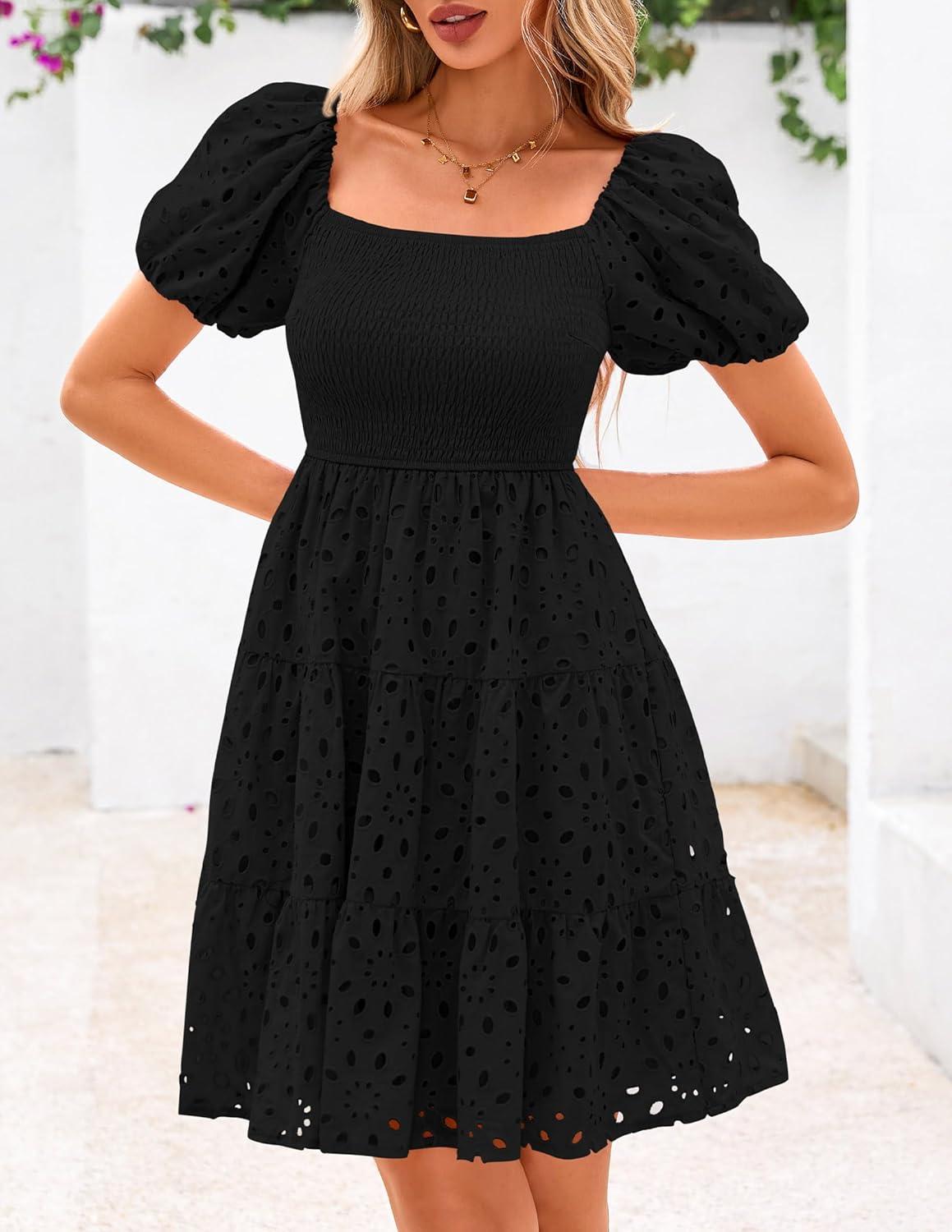 PRETTYGARDEN Womens Summer Puff Sleeve Mini Dress Off Shoulder Eyelet Smocked A Line Casual Babydoll Short Dresses(Black)