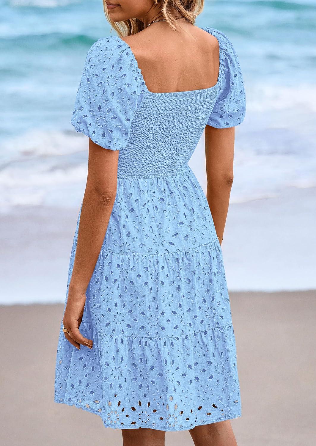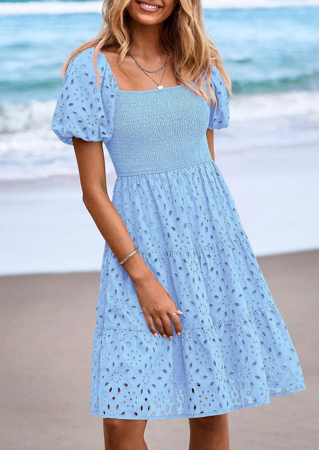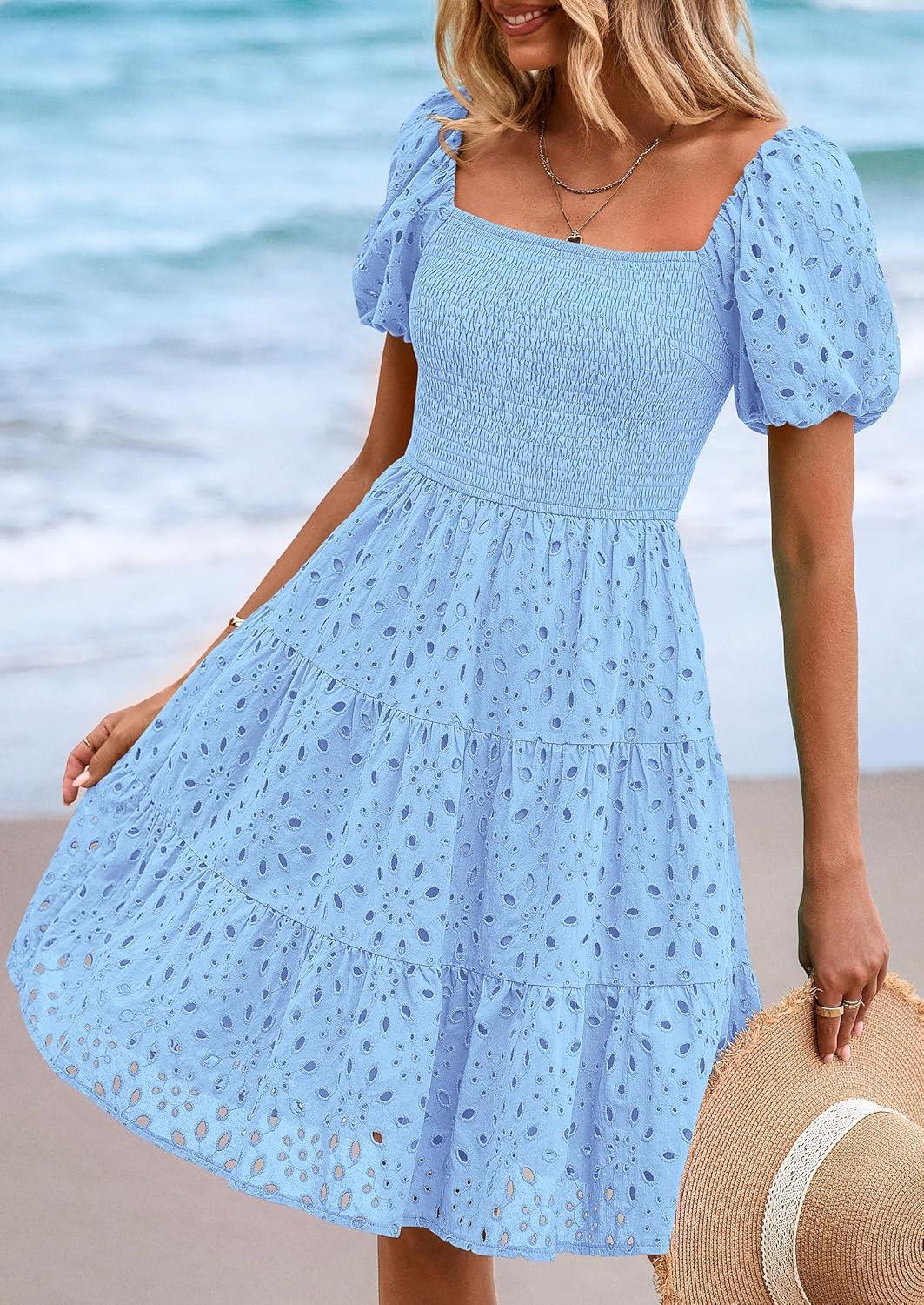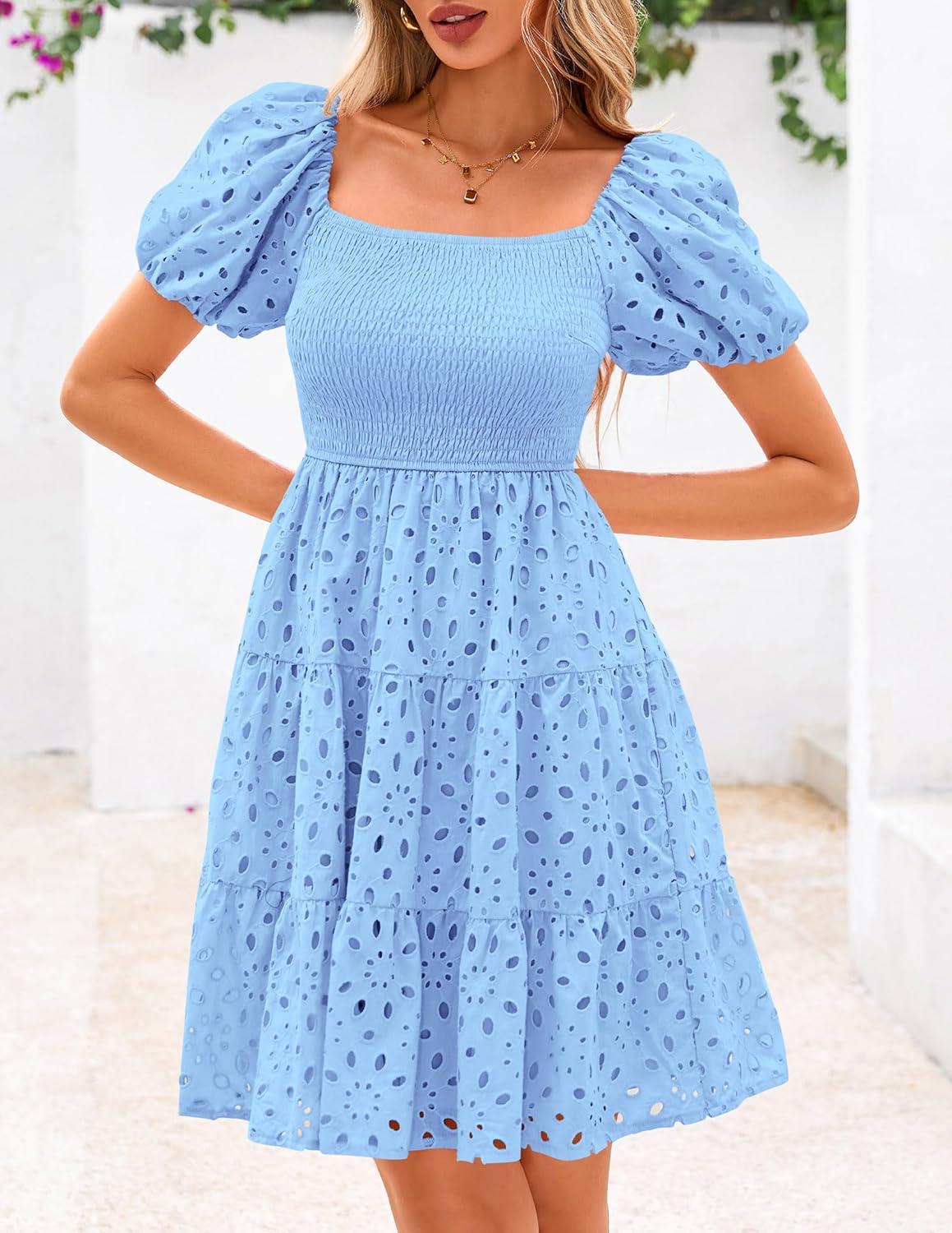 PRETTYGARDEN Womens Summer Puff Sleeve Mini Dress Off Shoulder Eyelet Smocked A Line Casual Babydoll Short Dresses(Blue)