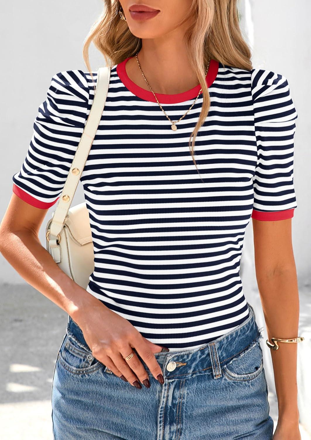PRETTYGARDEN Women's Summer Puff Sleeve Tops Casual Ribbed Knit Crop Top Color Block Trendy Crewneck Striped Shirts(Navy)