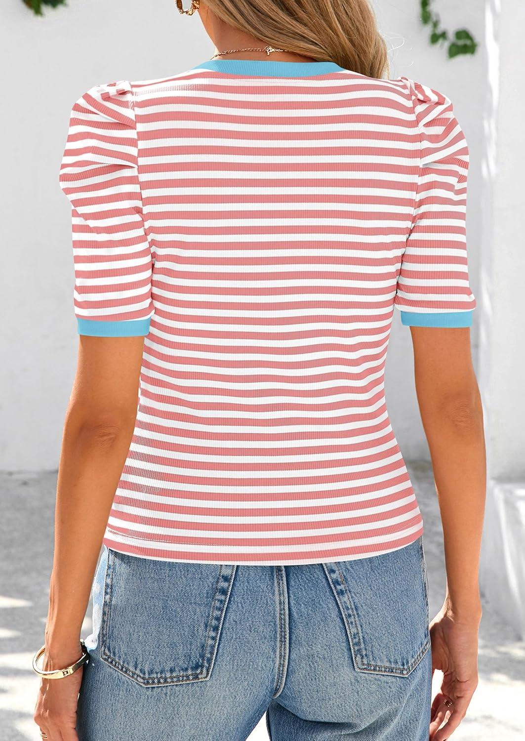 PRETTYGARDEN Women's Summer Puff Sleeve Tops Casual Ribbed Knit Crop Top Color Block Trendy Crewneck Striped Shirts(Pink)
