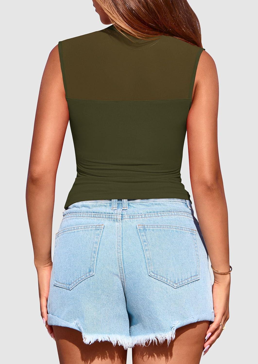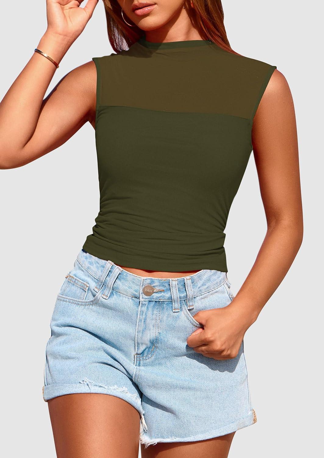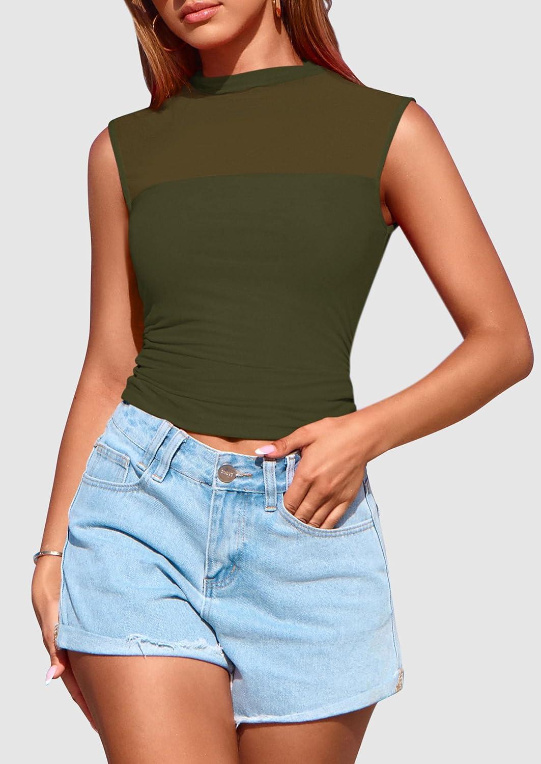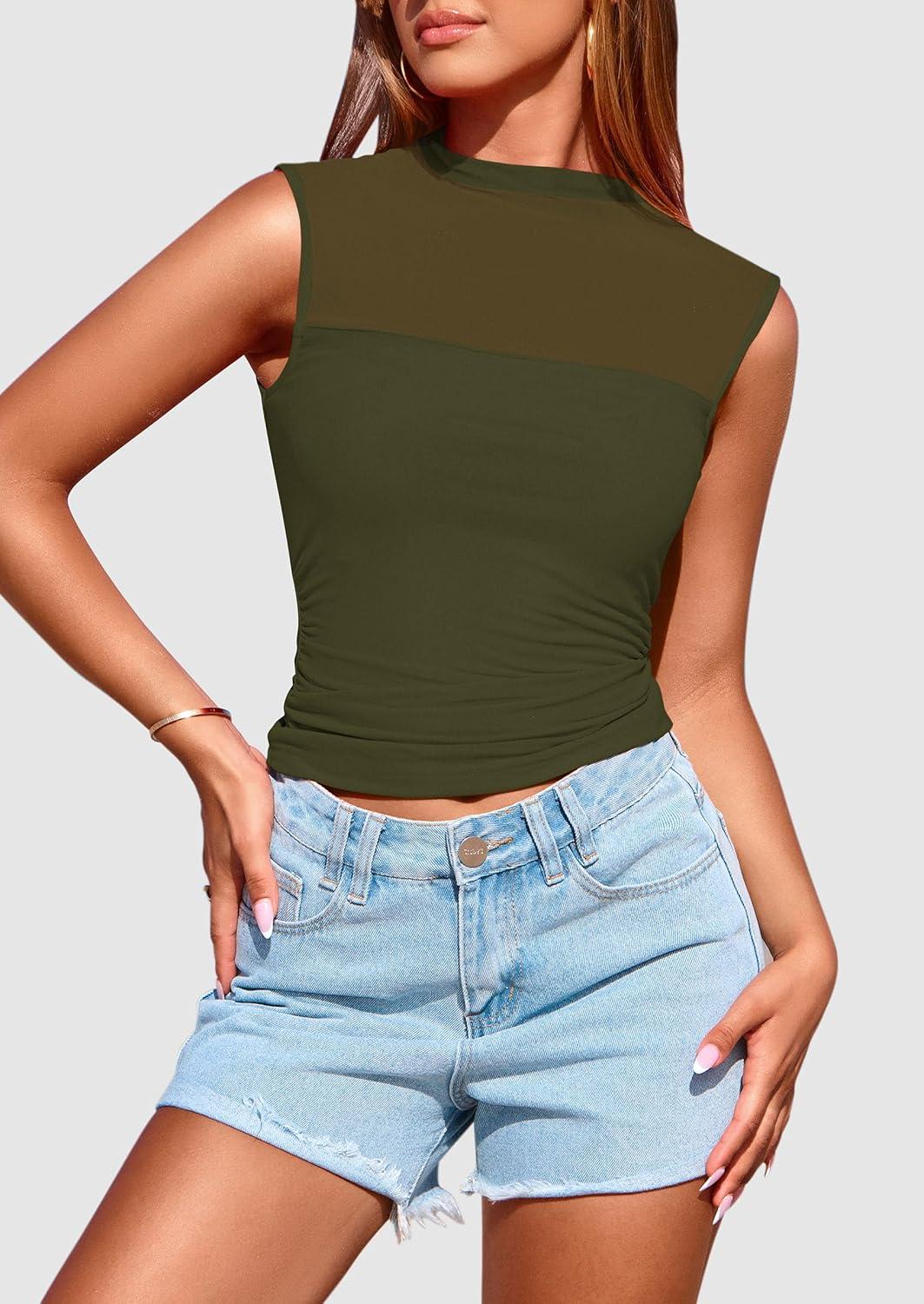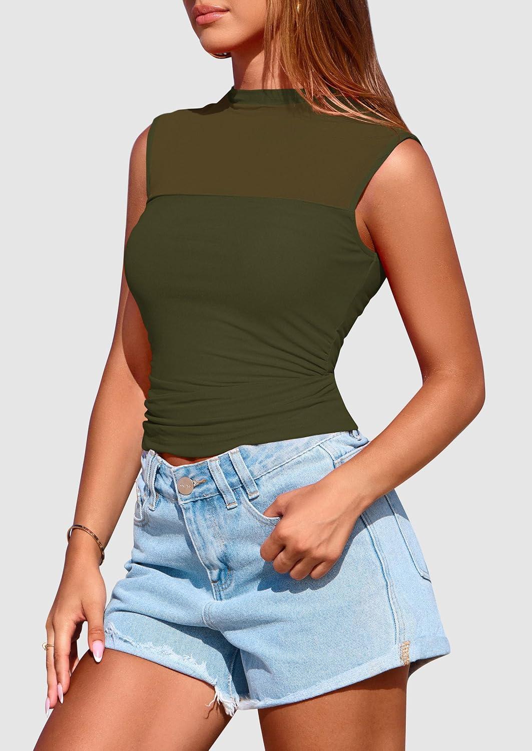 PRETTYGARDEN Women's Summer Sheer Mesh Tank Tops 2025 Trendy Casual Sleeveless Mock Neck Ruched Slim Fitted Going Out Shirts(Army Green)
