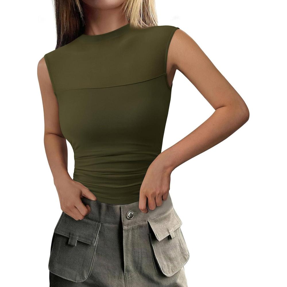 PRETTYGARDEN Women’s Summer Sheer Mesh Tank Tops 2025 Trendy Casual Sleeveless Mock Neck Ruched Slim Fitted Going Out Shirts(Army Green)
