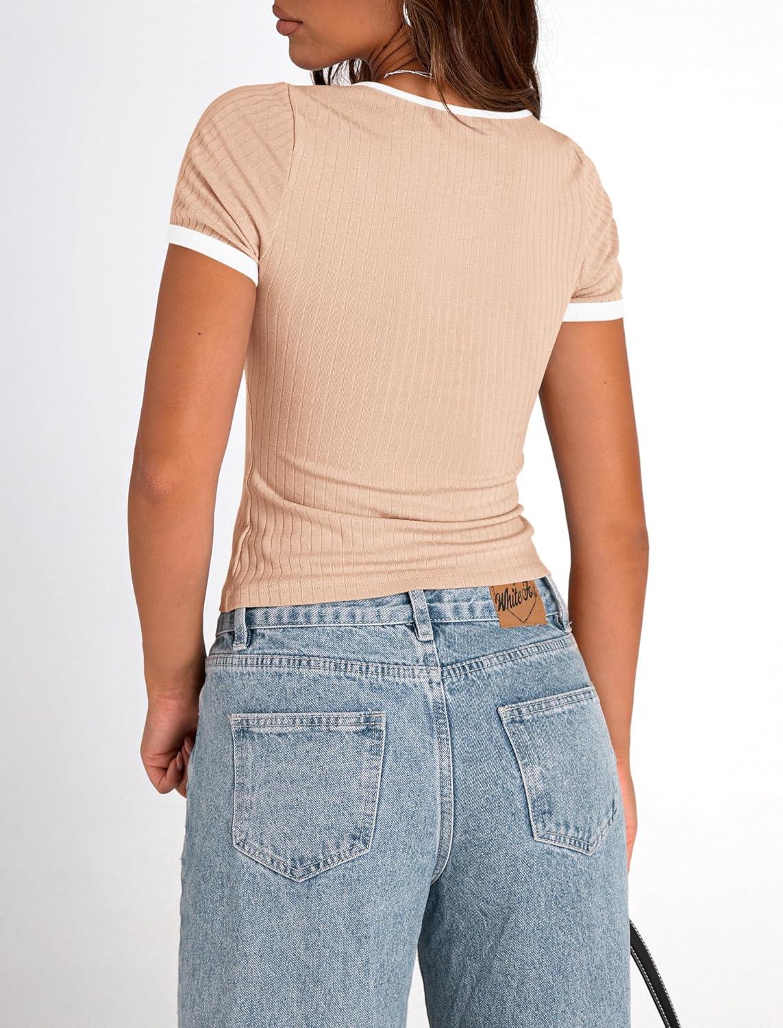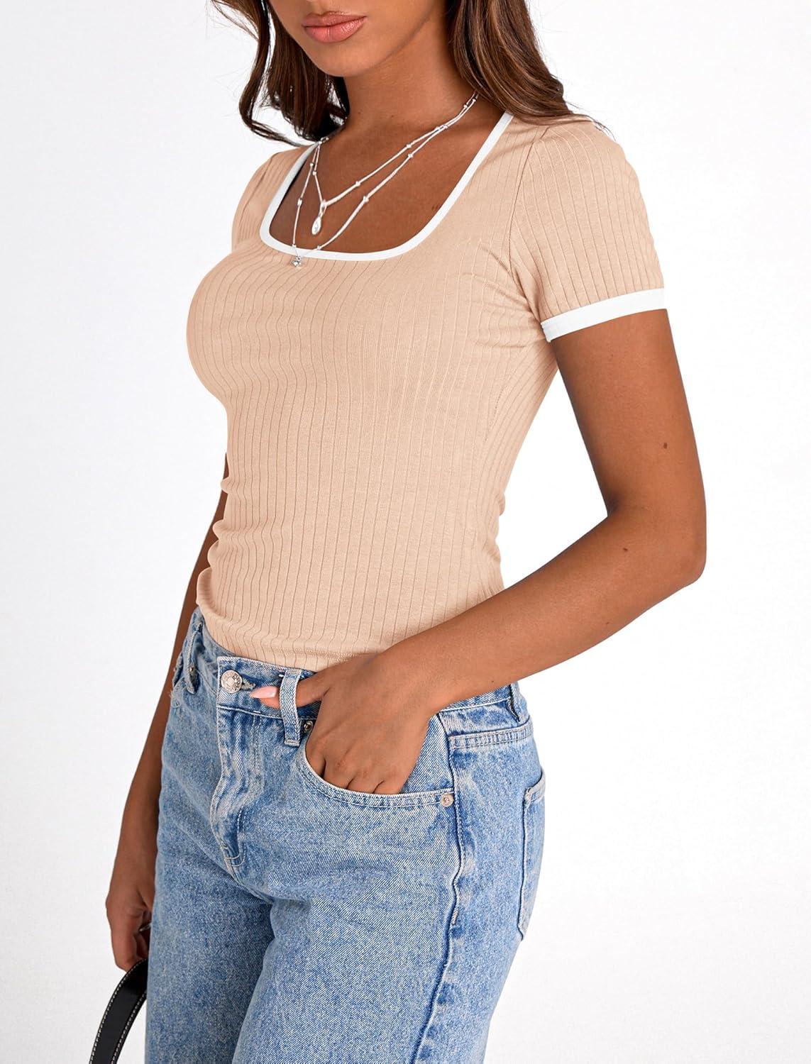 PRETTYGARDEN Women's Summer Short Sleeve T Shirts Ribbed Knit Square Neck Color Block Slim Fit Basic Casual Crop Tops Blouses(Apricot)