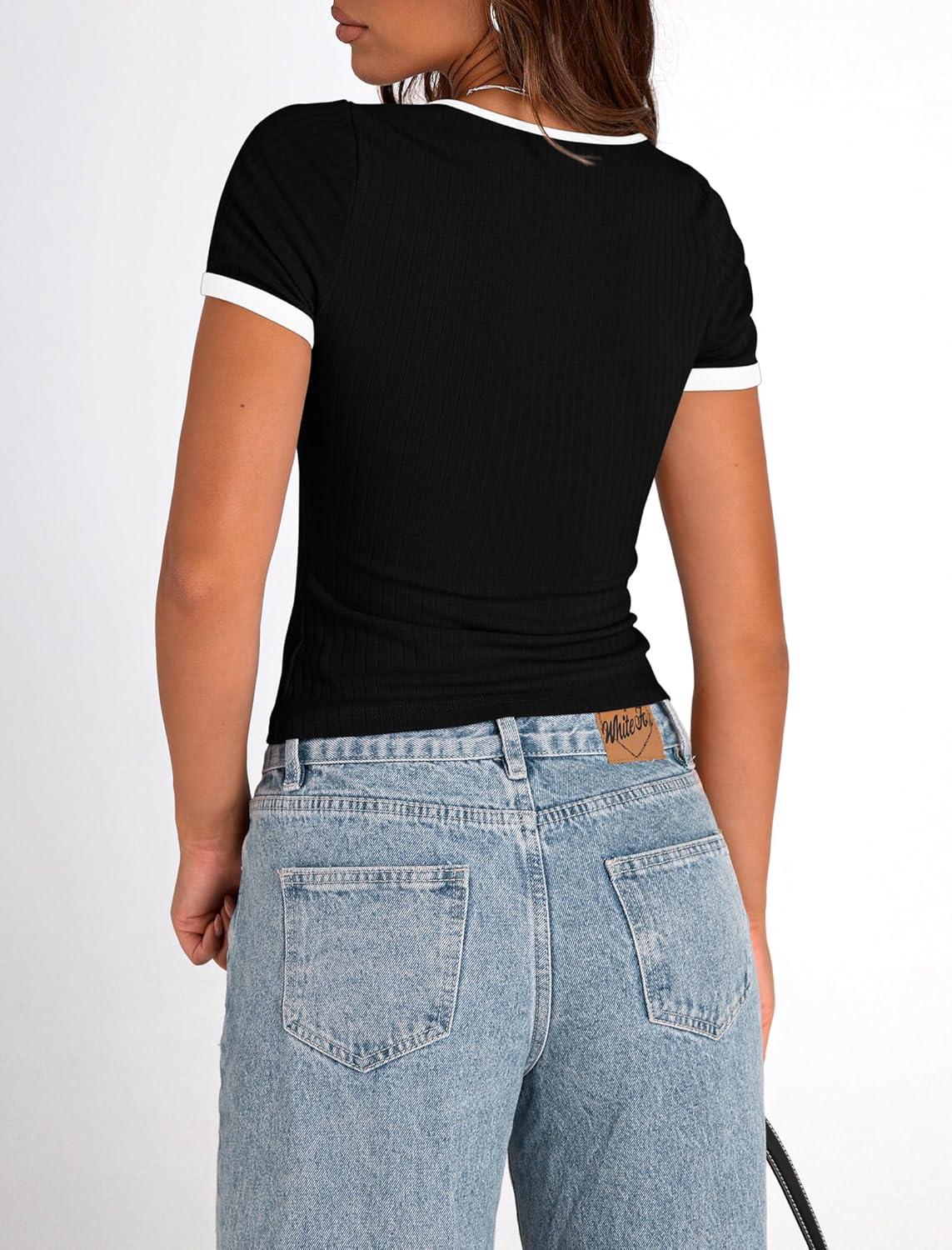 PRETTYGARDEN Women's Summer Short Sleeve T Shirts Ribbed Knit Square Neck Color Block Slim Fit Basic Casual Crop Tops Blouses(Black)