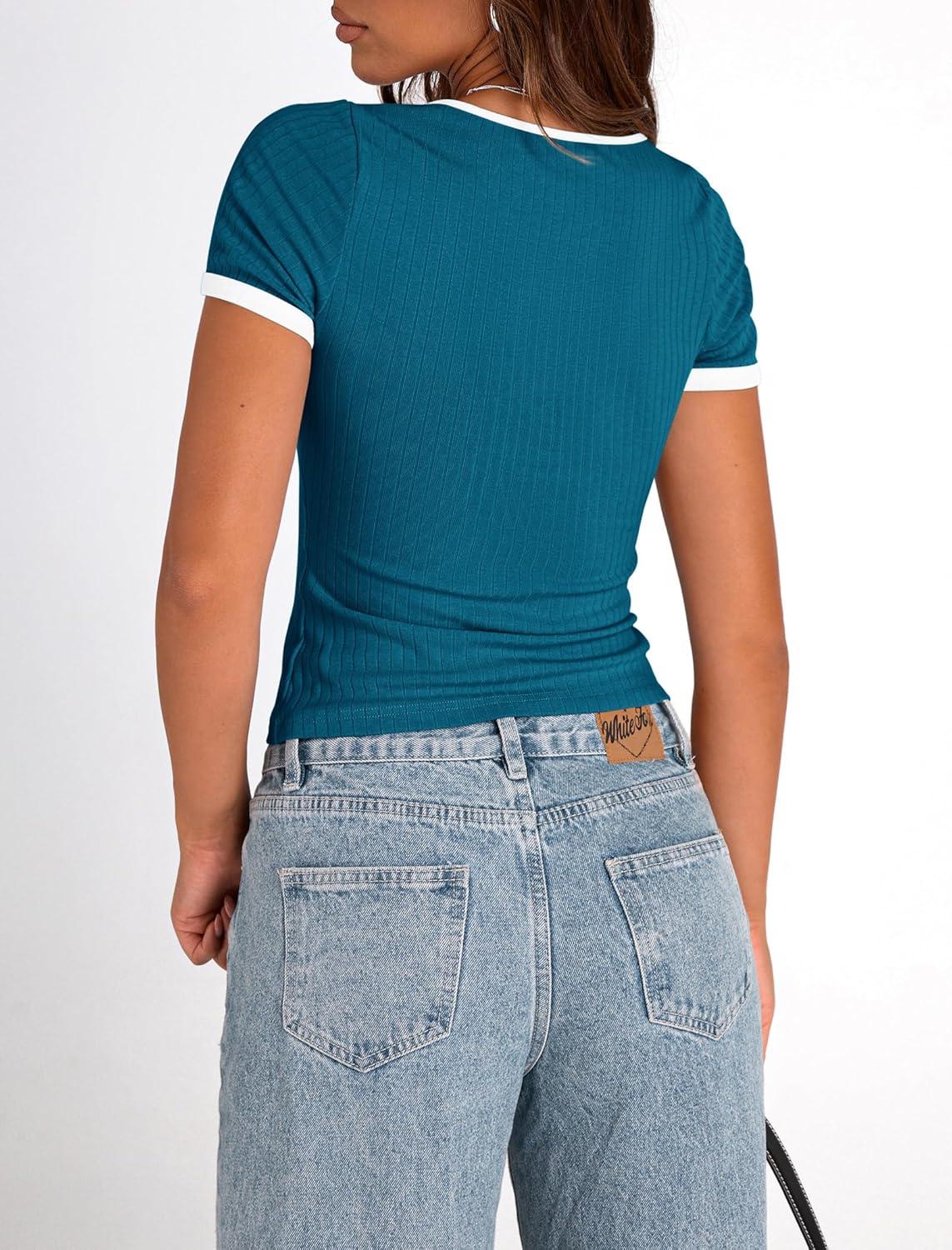PRETTYGARDEN Women's Summer Short Sleeve T Shirts Ribbed Knit Square Neck Color Block Slim Fit Basic Casual Crop Tops Blouses(Dark Blue)