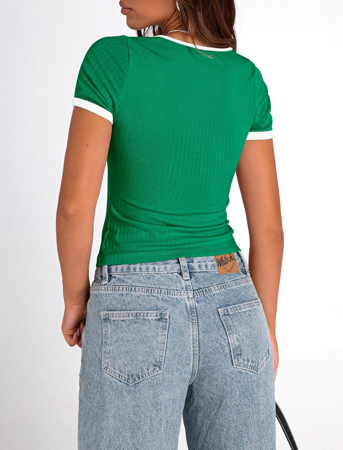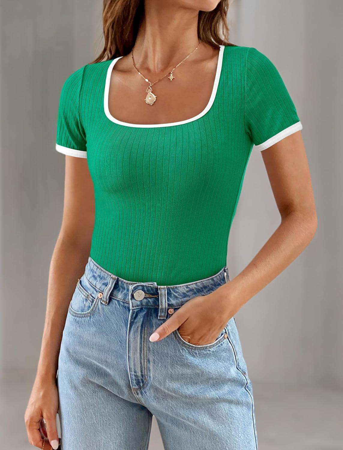 PRETTYGARDEN Women's Summer Short Sleeve T Shirts Ribbed Knit Square Neck Color Block Slim Fit Basic Casual Crop Tops Blouses(Green)