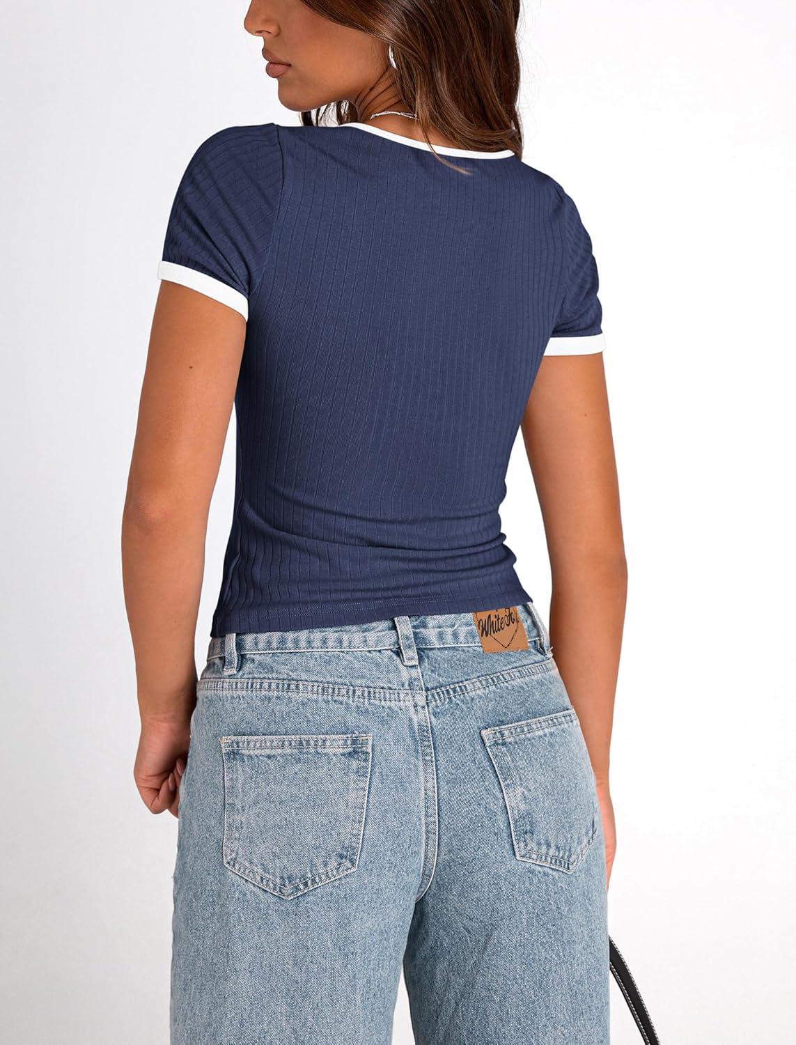 PRETTYGARDEN Women’s Summer Short Sleeve T Shirts Ribbed Knit Square Neck Color Block Slim Fit Basic Casual Crop Tops Blouses(Navy)