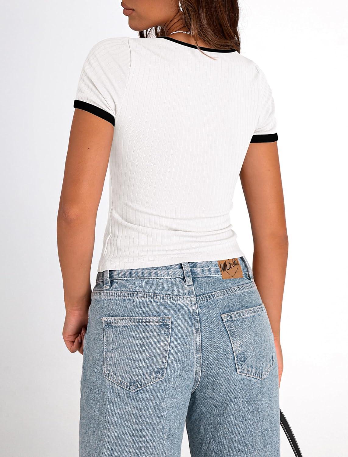 PRETTYGARDEN Women's Summer Short Sleeve T Shirts Ribbed Knit Square Neck Color Block Slim Fit Basic Casual Crop Tops Blouses(White)