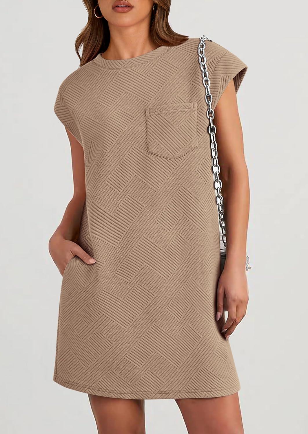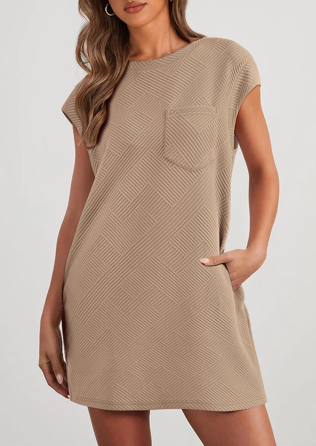 PRETTYGARDEN Women's Summer Short T Shirt Dress Cap Sleeve Crew Neck Casual Loose Basic Mini Dresses(Camel)