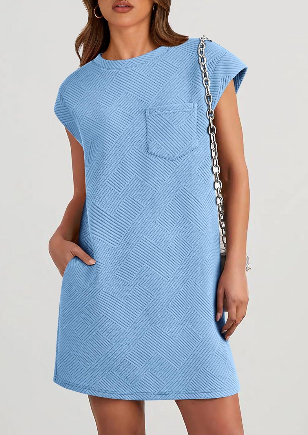 PRETTYGARDEN Women's Summer Short T Shirt Dress Cap Sleeve Crew Neck Casual Loose Basic Mini Dresses(Light Blue)