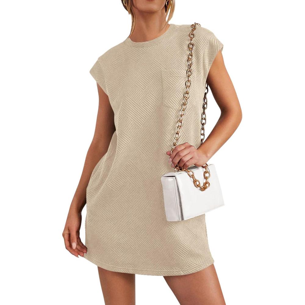 PRETTYGARDEN Women's Summer Short T Shirt Dress Cap Sleeve Crew Neck Casual Loose Basic Mini Dresses(Light Khaki)