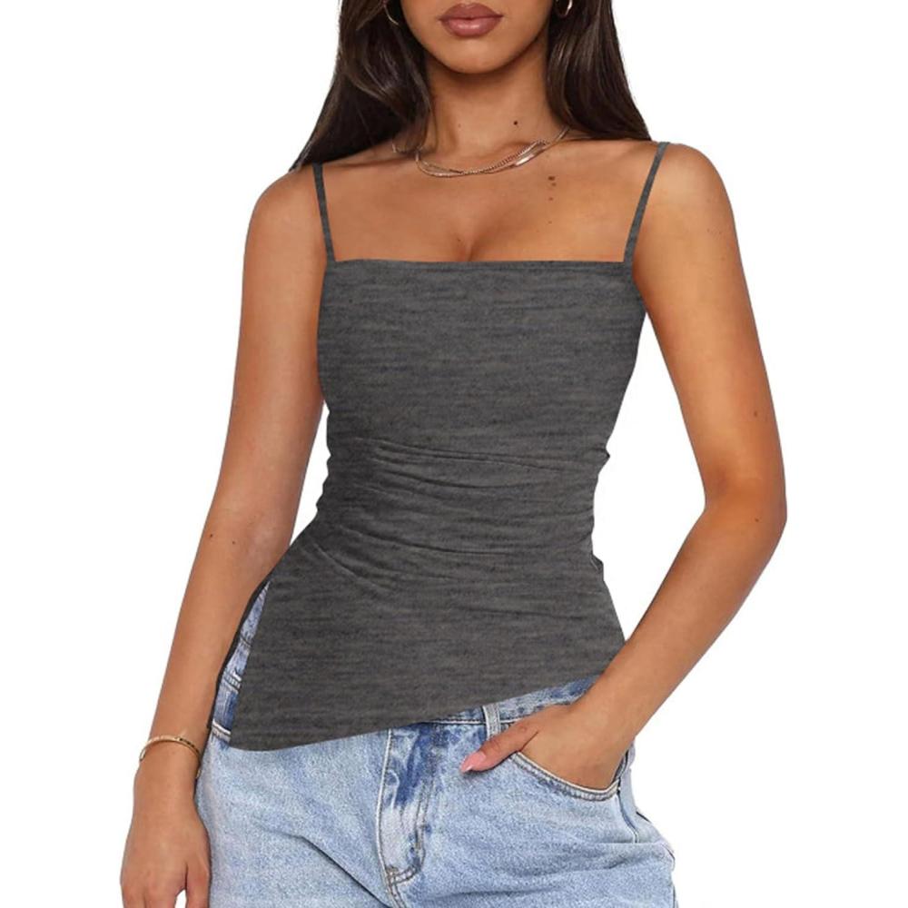 PRETTYGARDEN Women's Summer Spaghetti Strap Tank Tops Sleeveless Camisole Blouses Asymmetrical Going Out Basic Tank Shirt(Grey)