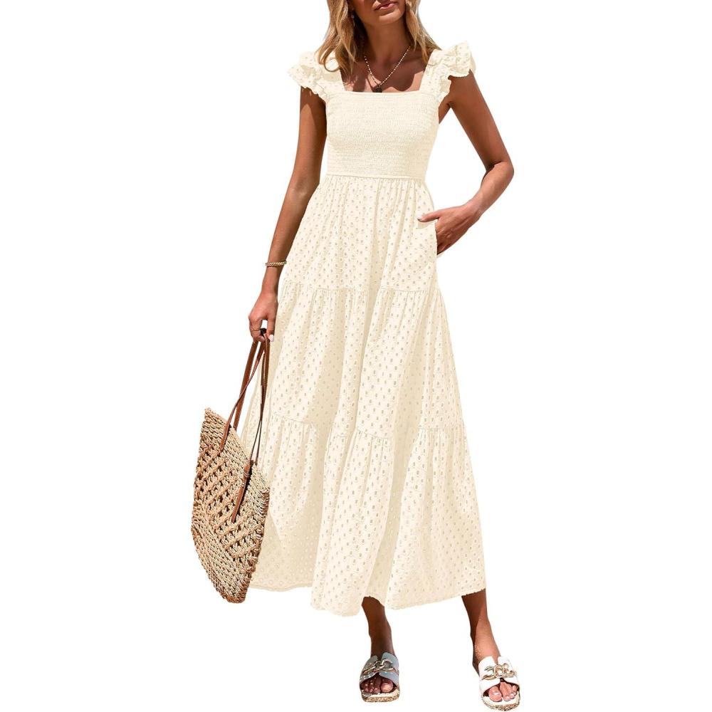 PRETTYGARDEN Womens Summer Square Neck Maxi Dresses Cap Sleeve Eyelet Smocked Tiered A Line Flowy Long Dress with Pockets(Beige)